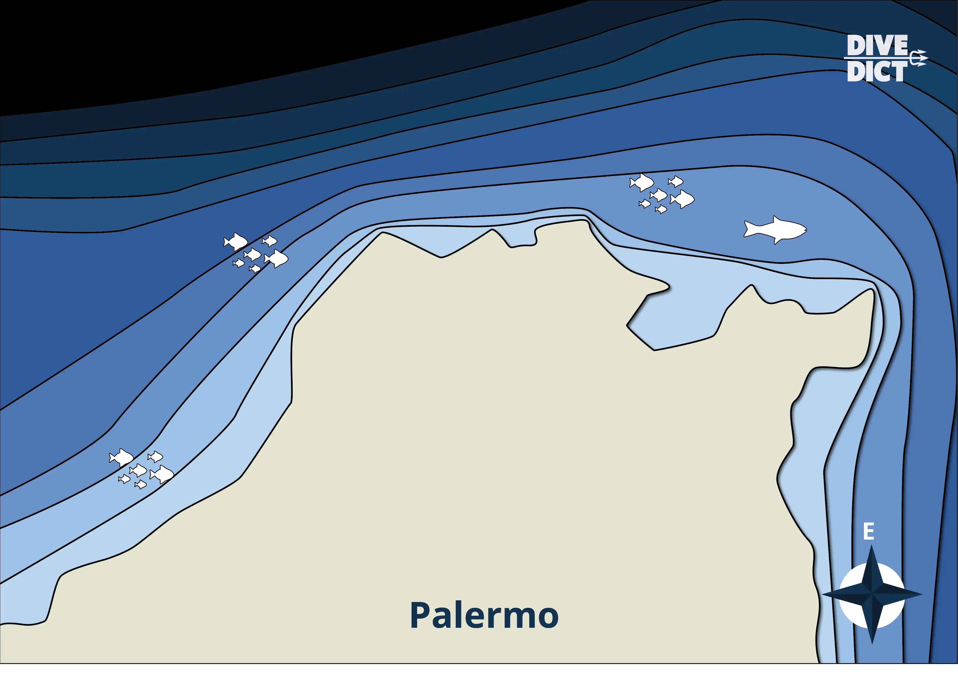 Das Gelände fällt, in 5 m beginnend, stets sanft bis zum Felsen ab und ist mit Sicherheit eine leichte und aufregende erste Unterwassererfahrung.