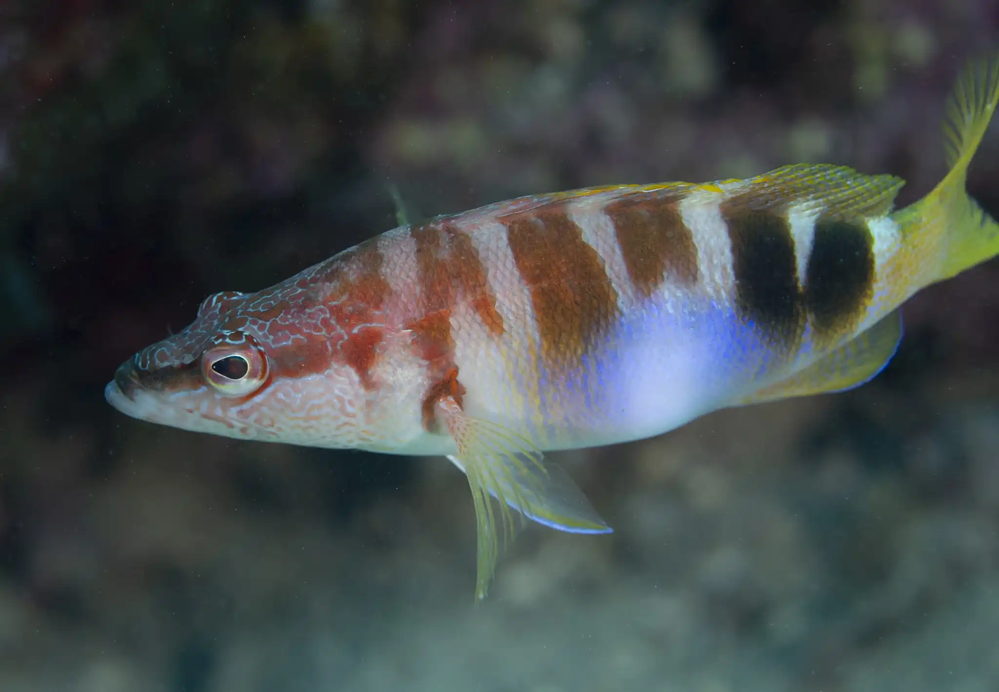 In den Seegraswiesen finden die Schriftbarsche (Seranus scriba) ihr Lieblings-Habitat und wuseln dort zu jeder Tageszeit herum.