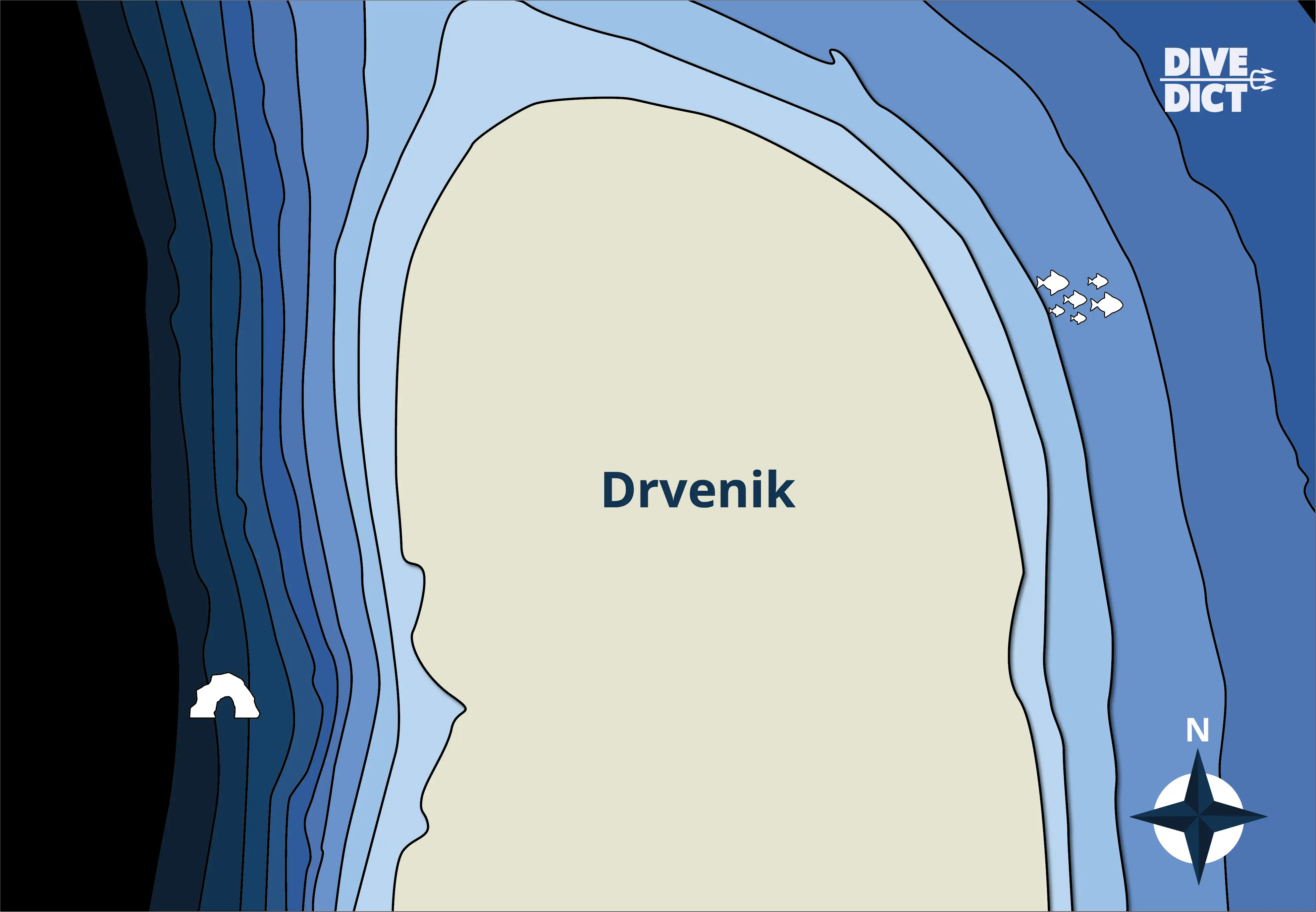 Der im Nordwesten des Inselchens Drvenik gelegene Dive-Spot bietet eine für ausschließlich fortgeschrittene Taucher geeignete Steilwand.