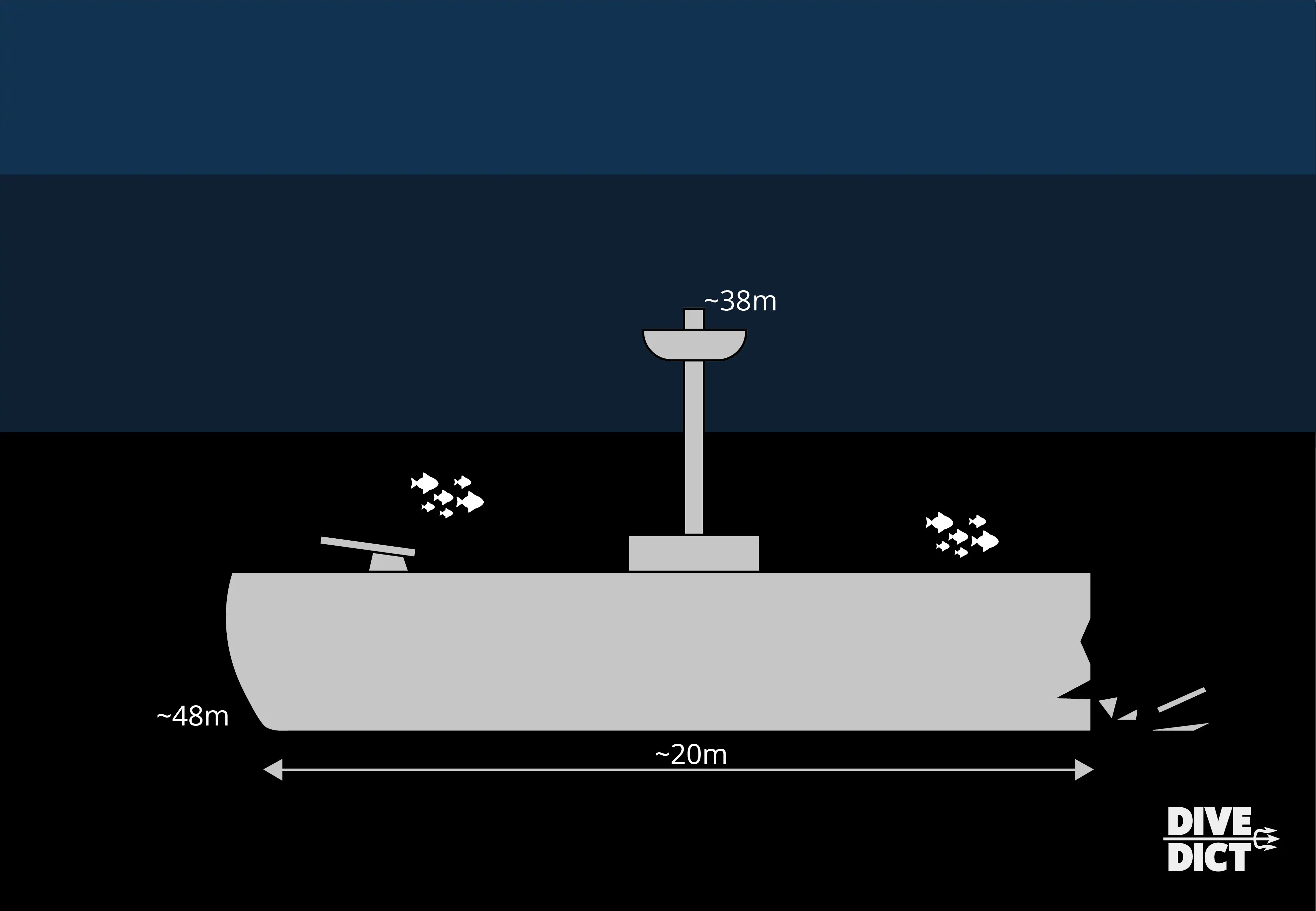 Jeder taucht zuerst um die Kanone herum, weil man sich dort ein bisschen wie auf einer Zeitreise fühlt. Sie ist noch völlig intakt und sieht aus, als würde sie gleich anfangen, Munition (102 mm) zu spuken. Wirklich beeindruckend, wie sie die Zeit überdauert hat.