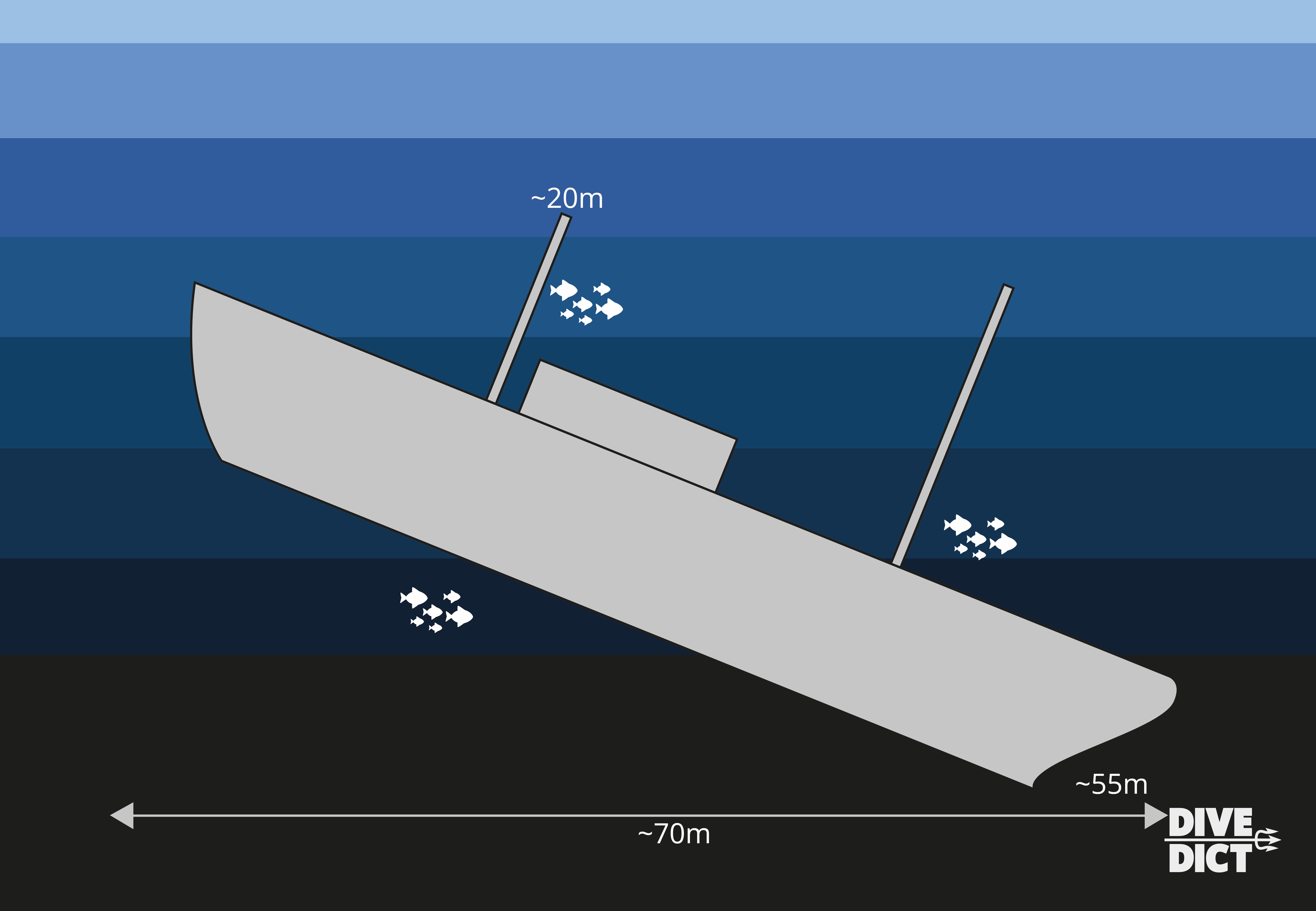 Ganz gleich, wie ihr dann weiter taucht, ihr müsst euch bewusst sein, dass die Lina sehr abfallend liegt! Am Heck seid ihr nämlich schon in 50 m und an der Schiffsschraube in 55 m Tiefe.