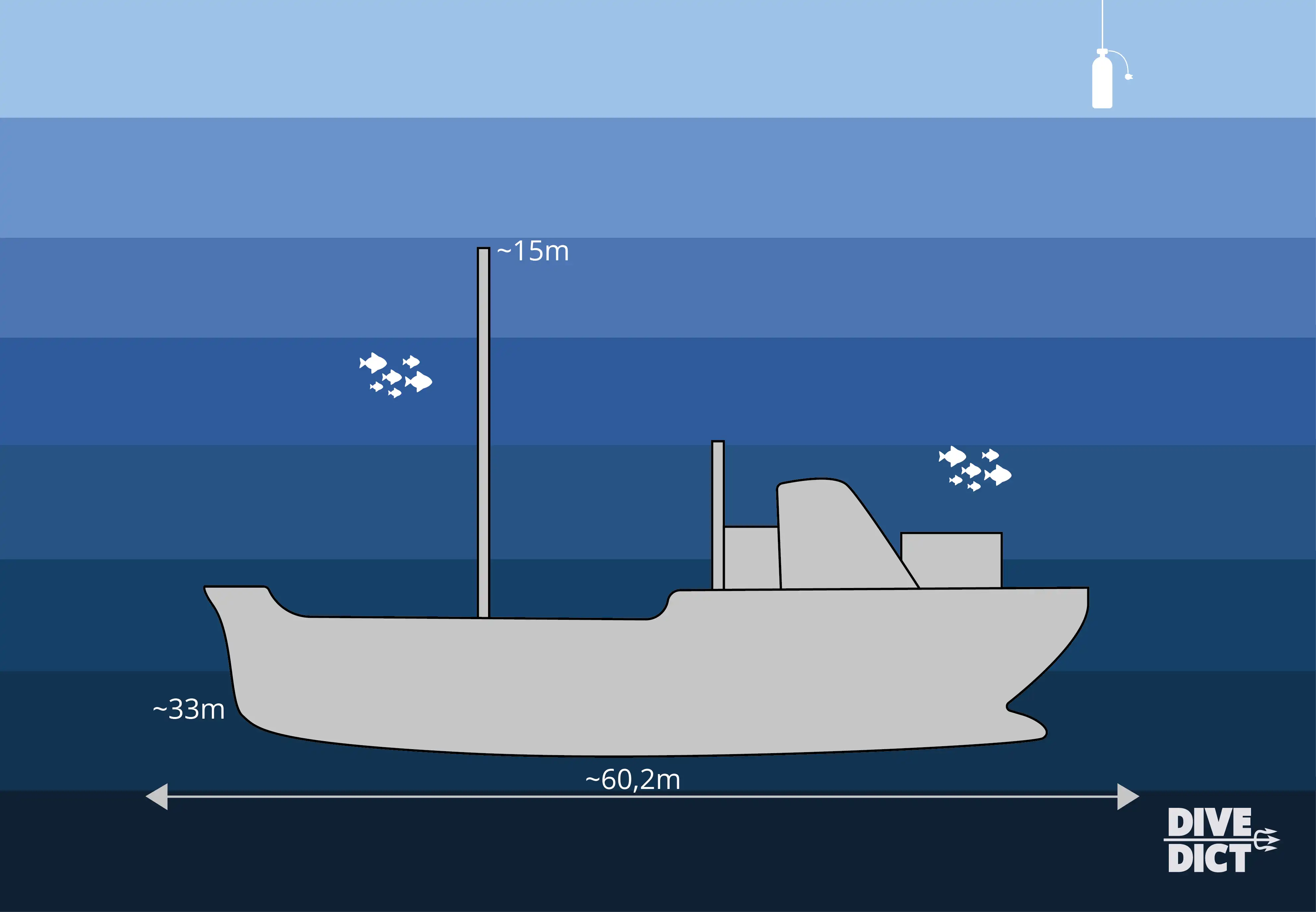 Im Velebit-Kanal beträgt die Sicht aufgrund der Strömungen selten mehr als zehn Meter, aber wegen der geringen Tiefe dringt das Sonnenlicht manchmal bis zum Wrack. Trotzdem heißt es bei diesem Tauchgang Gänsehaut pur unter dem Neopren.