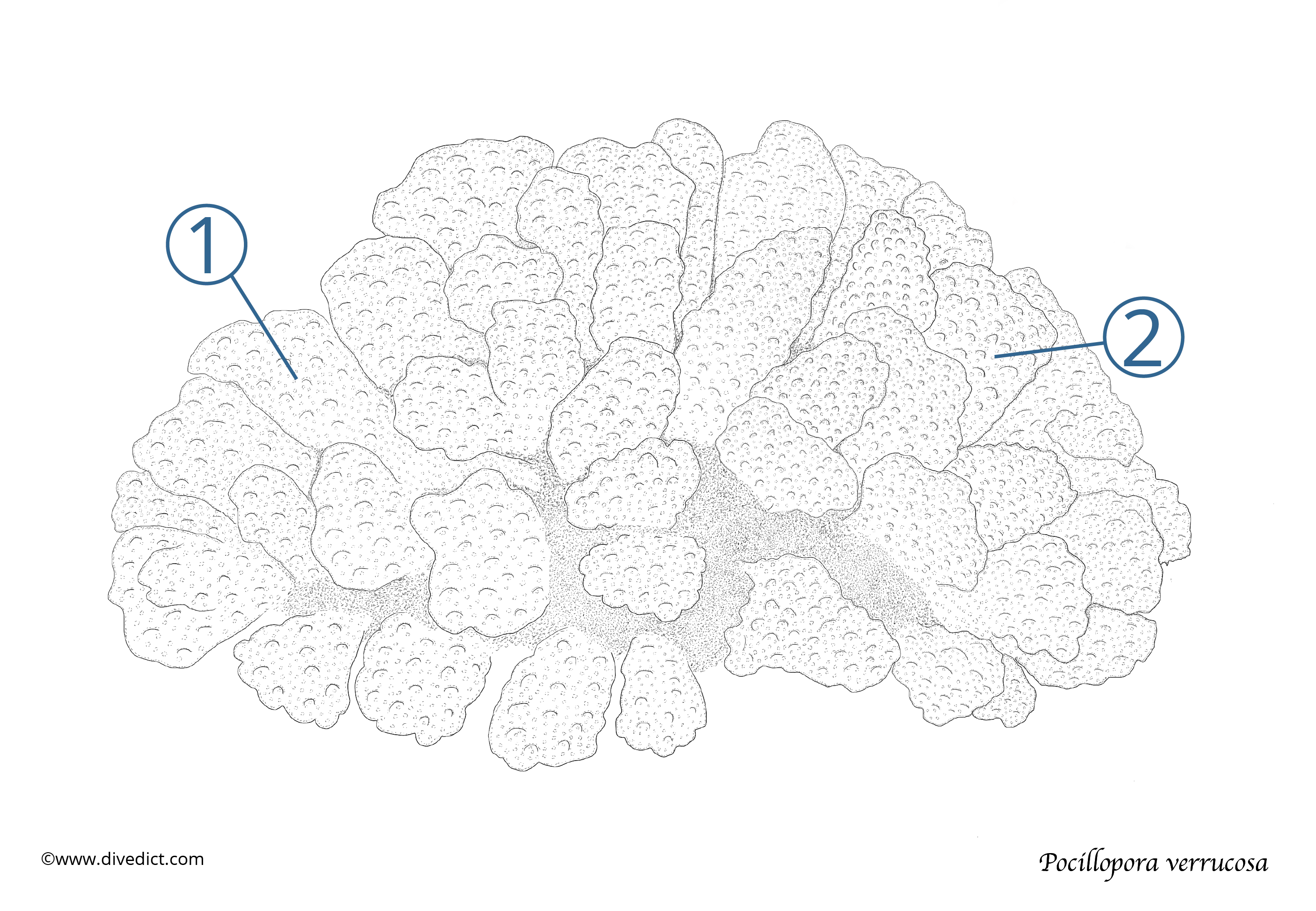 Pocillopora verrucosa ist eine Korallenart, die in runden Kolonien wächst. Diese Kolonien bestehen aus kräftigen, etwa gleich langen Ästen, die an ihren Enden stumpf abgerundet sind. Die Farben der Koralle können vielfältig sein und reichen von Creme über Graugrün und Graubraun bis hin zu Grün, Rosa und Blau.