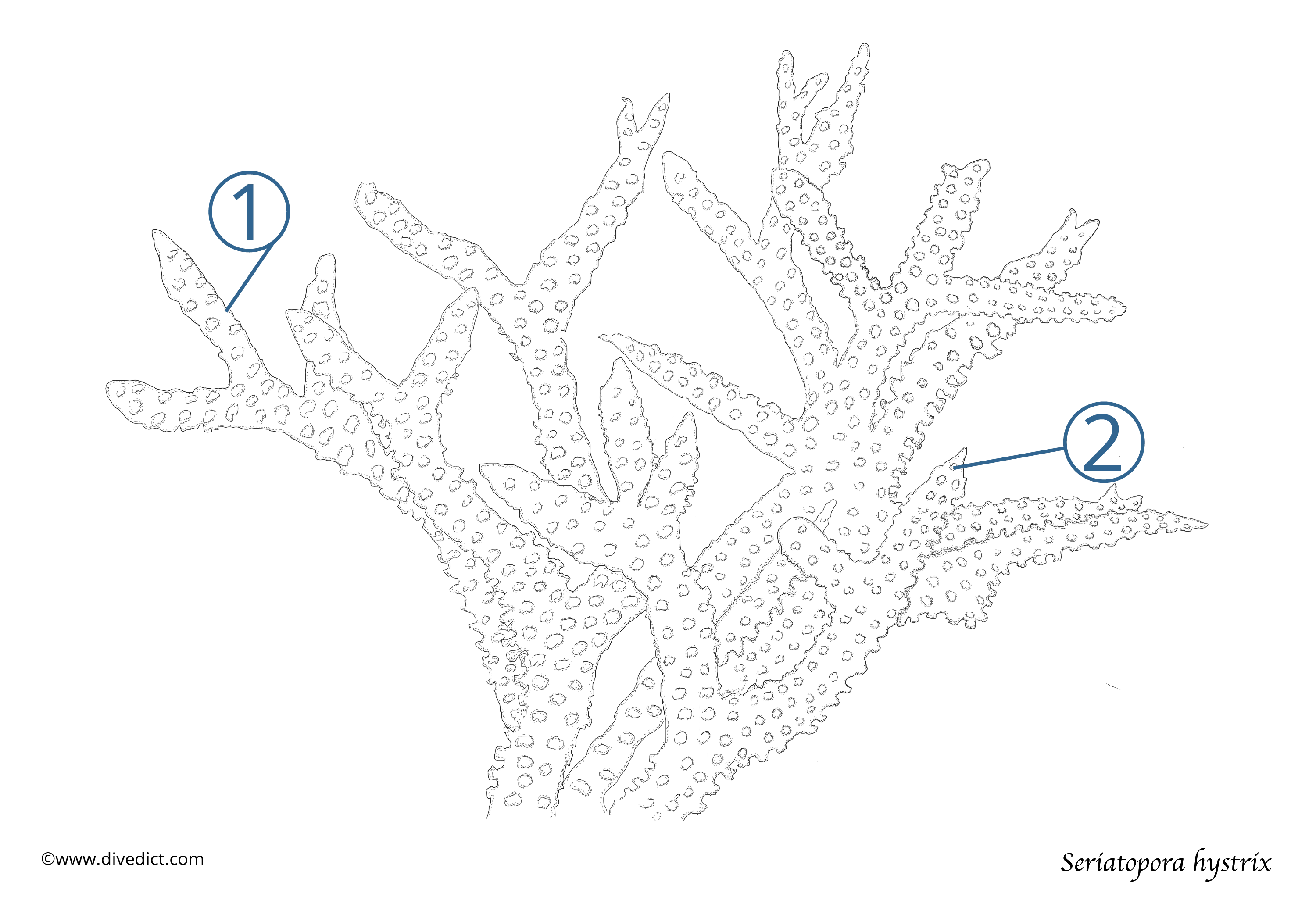 Die Stachelbusch-Koralle sieht aus wie ein filigranes Unterwasser-Vogelnest, mit feinen, spitzen Ästchen, die sich kunstvoll verzweigen. Dank ihrer Symbiose mit winzigen Zooxanthellen und ihrer Anpassung an Strömung und Licht schillert sie in allen Farben von zartem Rosa über warmes Braun bis hin zu kühlem Blau: ein echter Hingucker für Taucher!