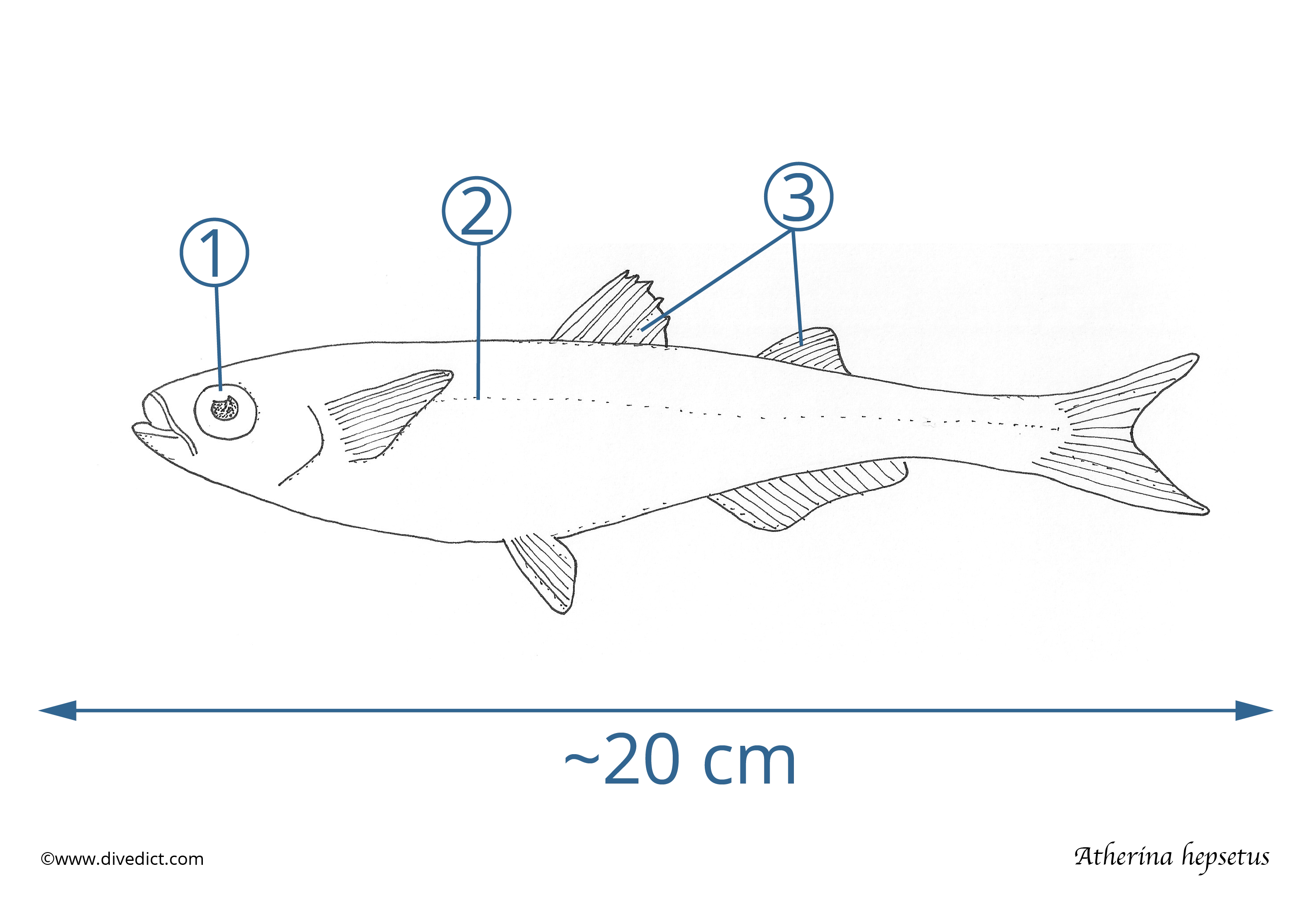 Die beiden Rückenflossen haben einen großen Abstand, wodurch man den Großen Ährenfisch gut von Sardinen unterscheiden kann.