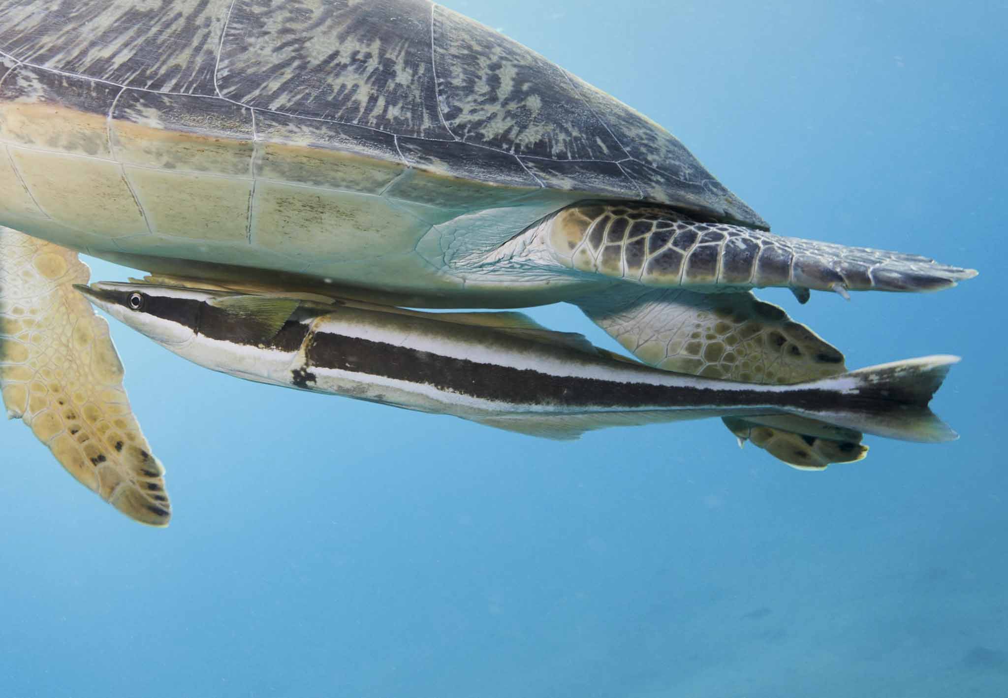 Der Gestreifte Schiffshalter schwimmt oft dicht an Haien, Rochen oder Schildkröten, an denen er sich mit seiner Saugscheibe festsaugt. Manchmal folgt er sogar Taucher*innen! Seine markanten schwarzen Längsstreifen und die runde Saugscheibe auf dem Kopf machen ihn leicht erkennbar.