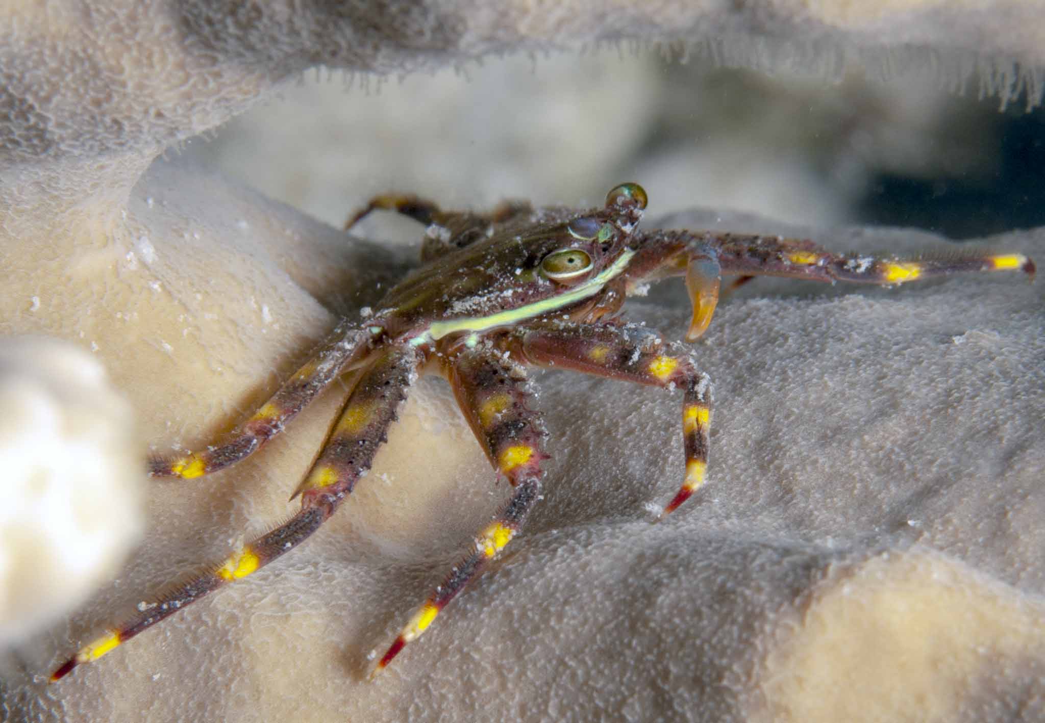 Die Algenfressende Krabbe hat ein besonders charakteristisches Aussehen. Diese Art ist flach, schmal und mit ihrer fluoreszierenden Musterung gut an ihr Leben in seichter, felsiger Umgebung angepasst. Auffällig ist, dass ihre Beine ein gelb-weißlich gestreiftes Muster aufweisen.