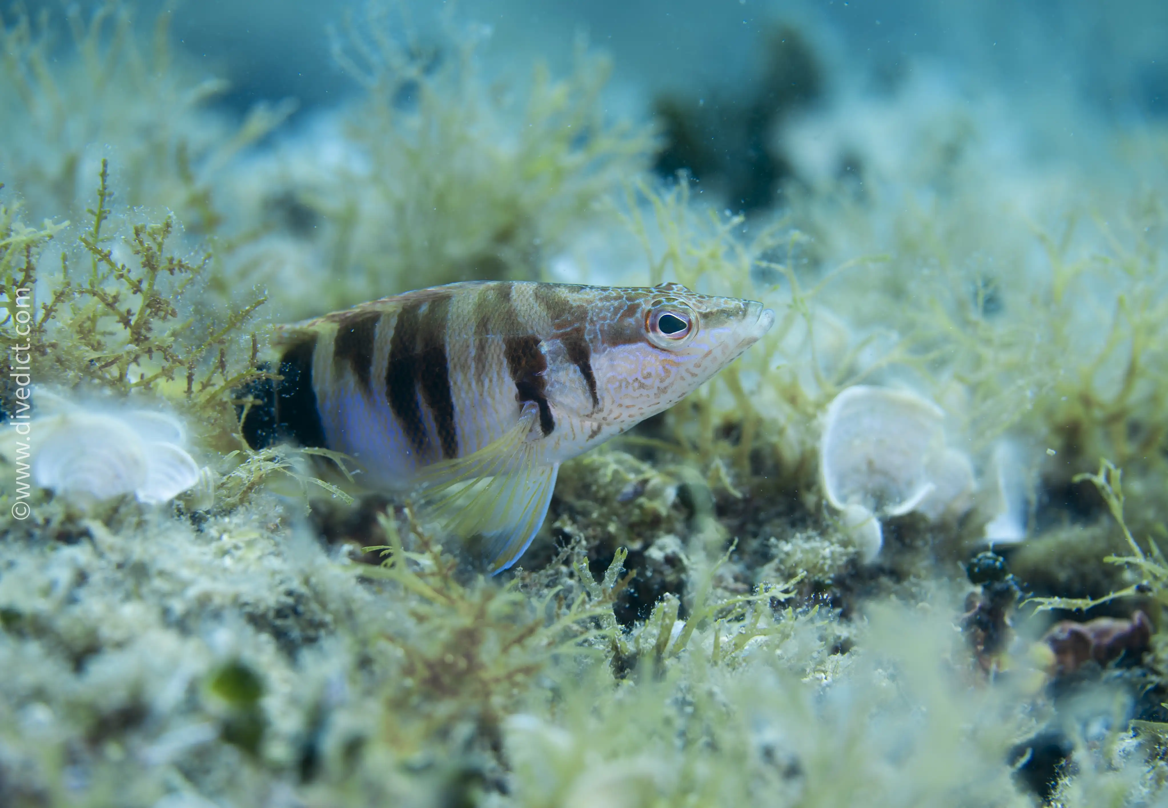 Among the grasses, there is an abundance of fish, seahorses, crabs, starfish, and sponges; occasionally, even lionfish make an appearance. At the end of the seagrass meadow, a rocky wall extends down to approximately 25 m depth.