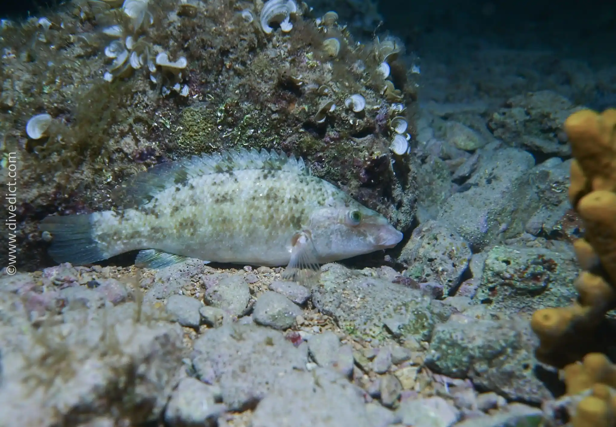 Those who dive along the wall down to 25m can explore the sandy areas of this site. Some stingrays swim around there.