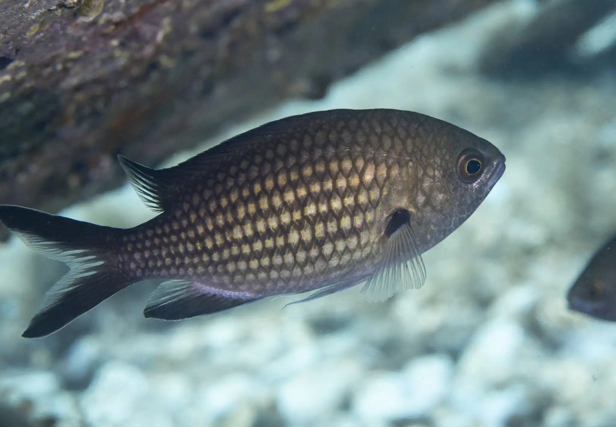One can follow the rocky bottom 28 m into the interior of the rock until it ends in a fairly narrow chamber where large grouper like to hide.