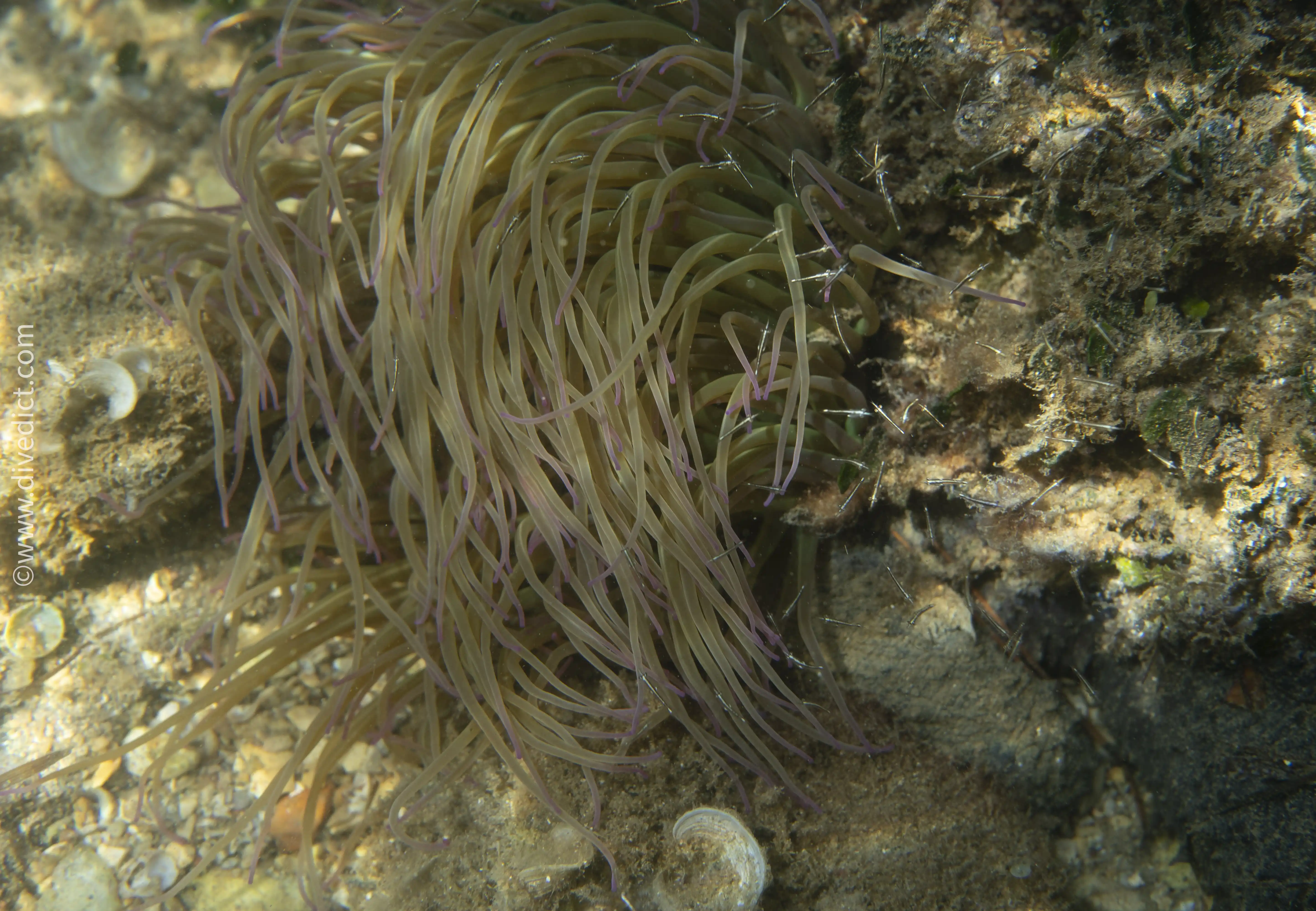 Additionally, the gorge leads to a picturesque cave with a very sedimentary seabed, which is an ideal habitat for sea bream, nudibranchs, and anemones (Anemonia sulcata).