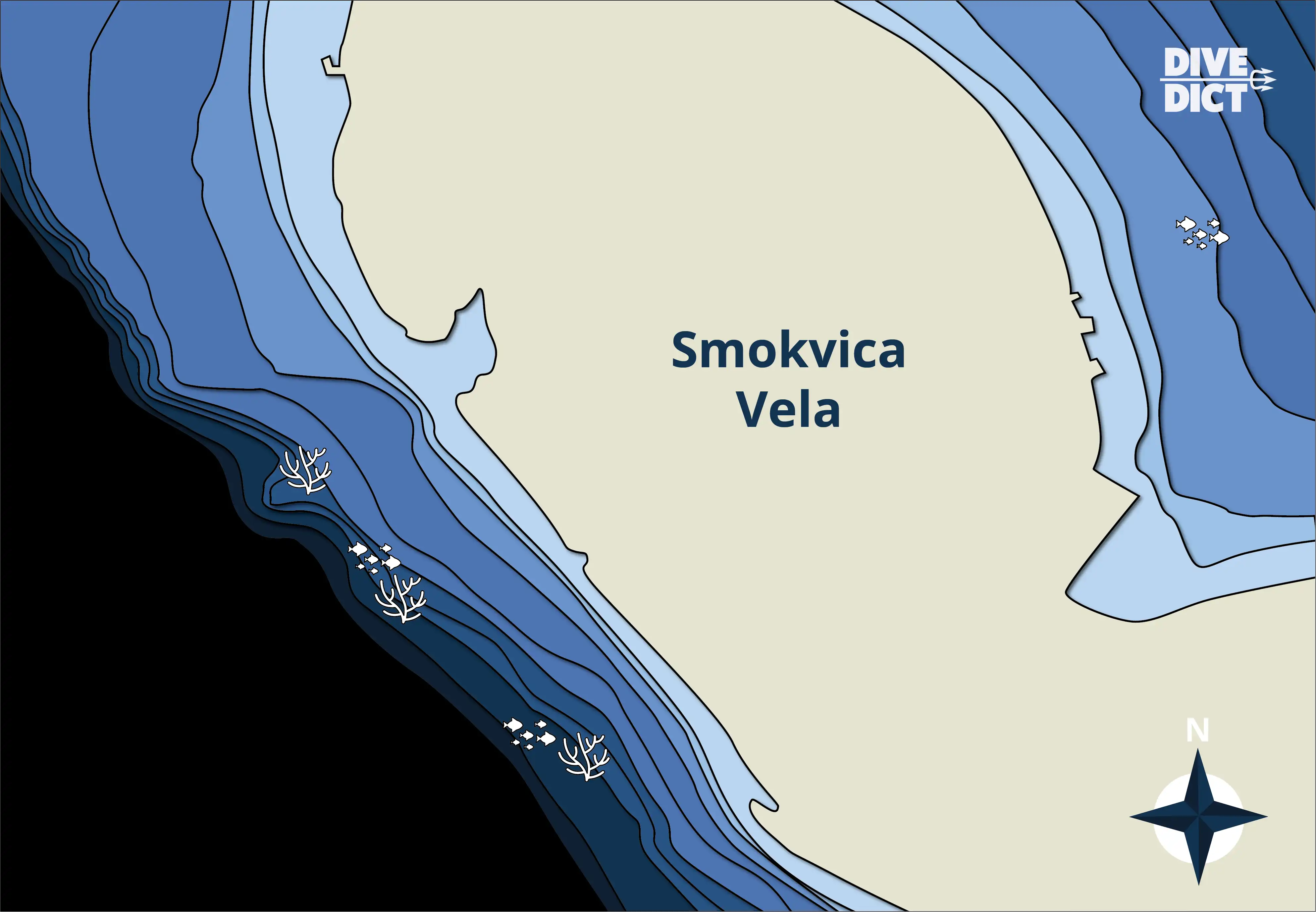 The dive begins on a plateau at a depth of 3 to 8 m.