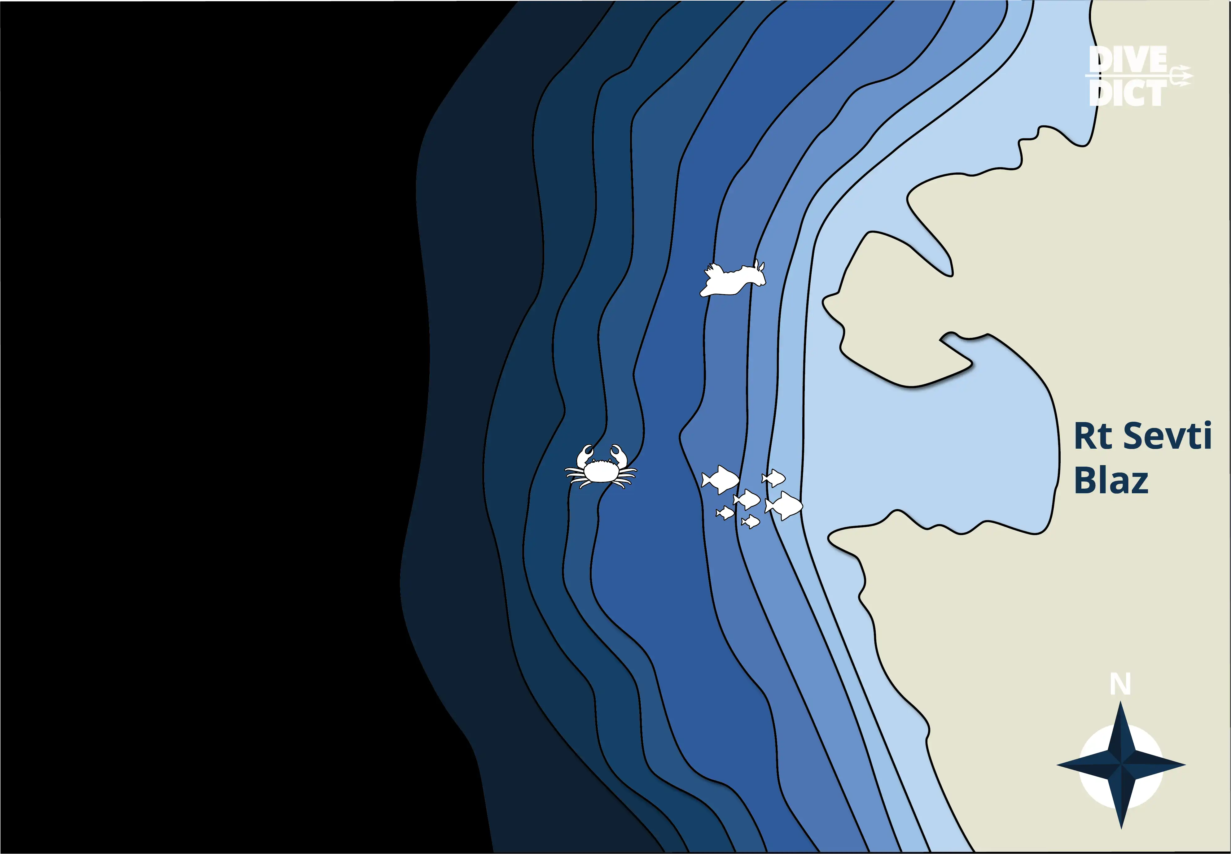 The dive site is marked by a larger elongated rock that protrudes from the water.
