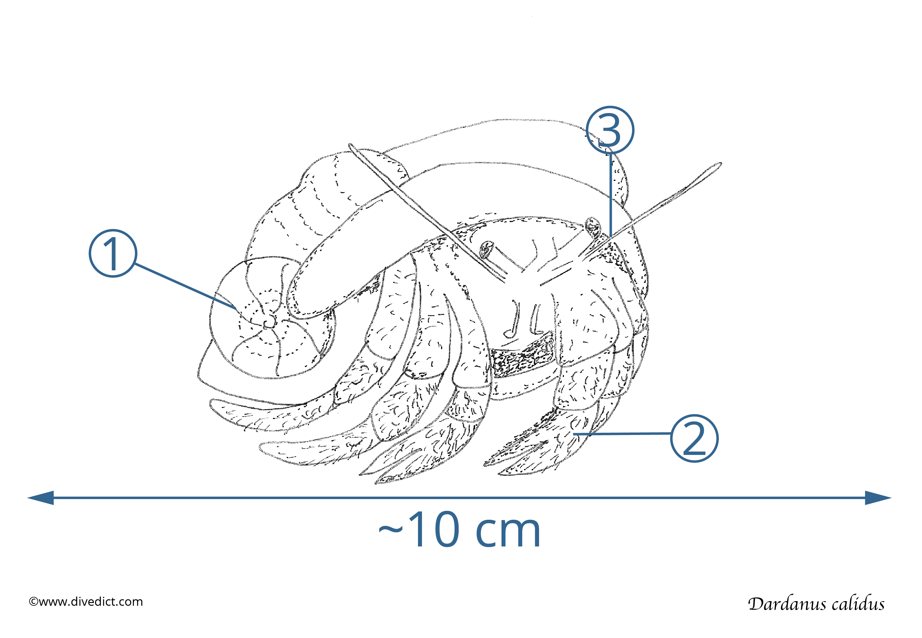 The Hermit Crab can grow up to 10cm tall and thus surmount all other hermit crabs in the Mediterranean.