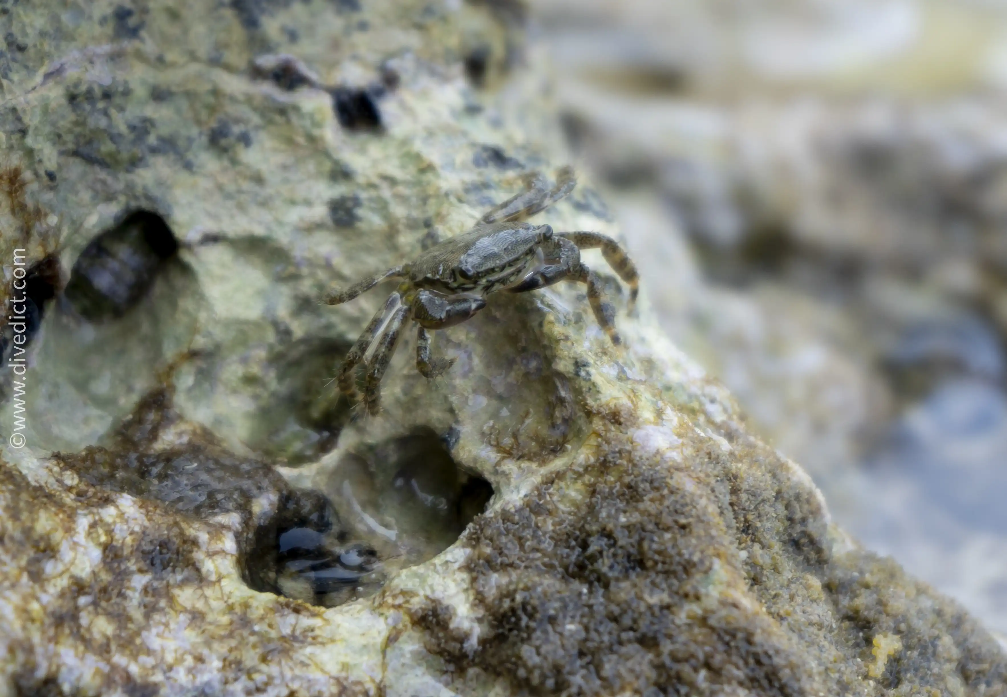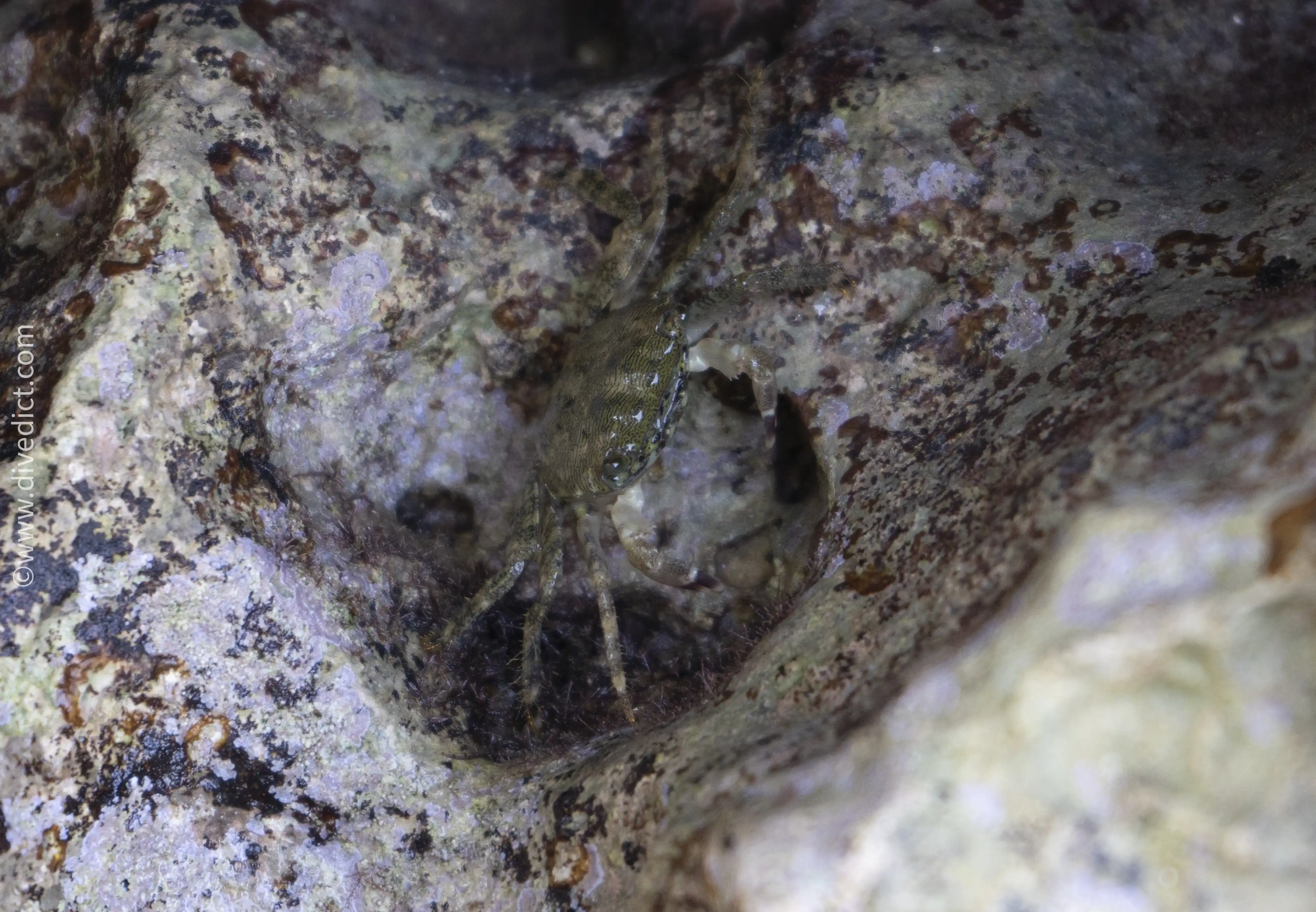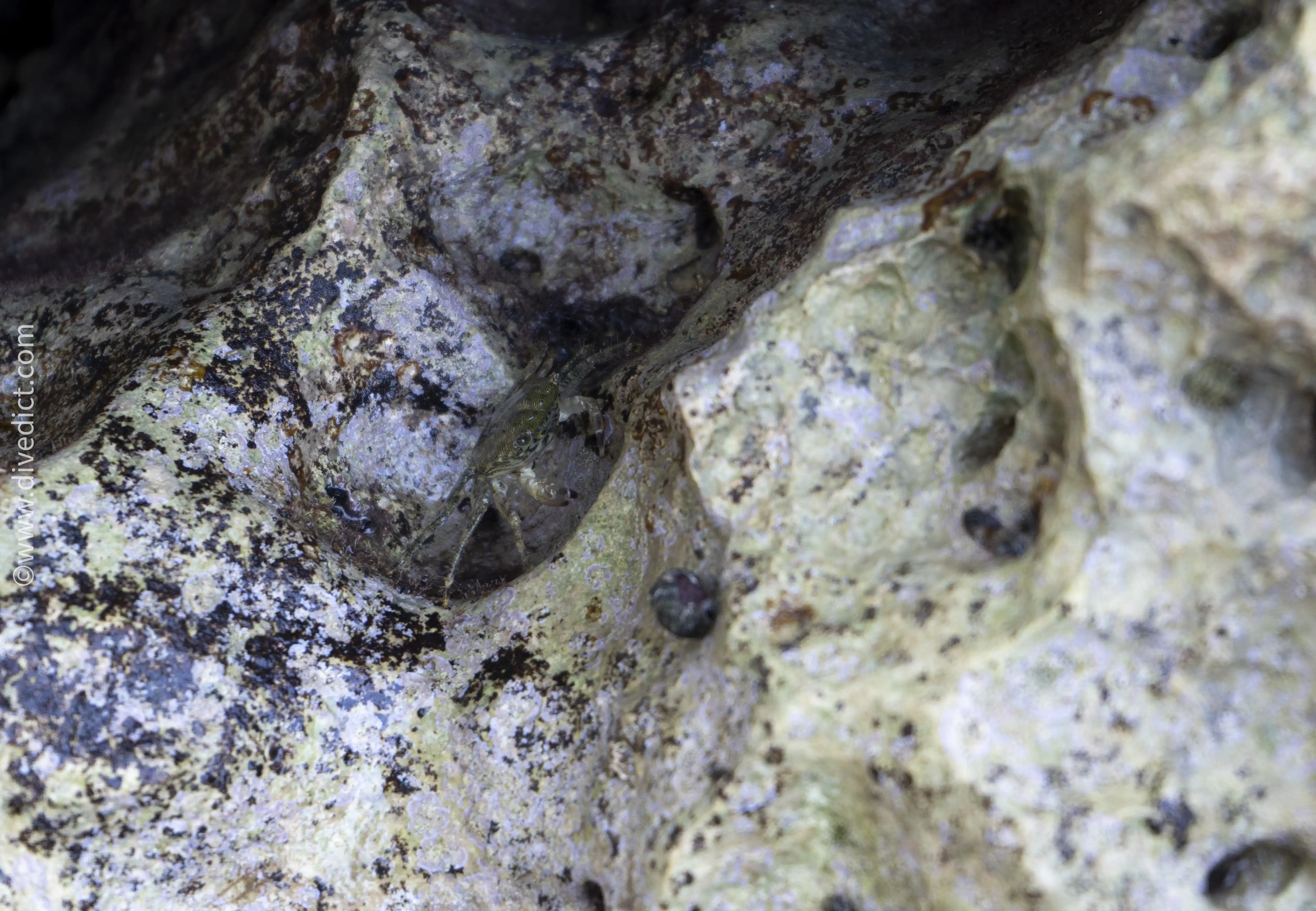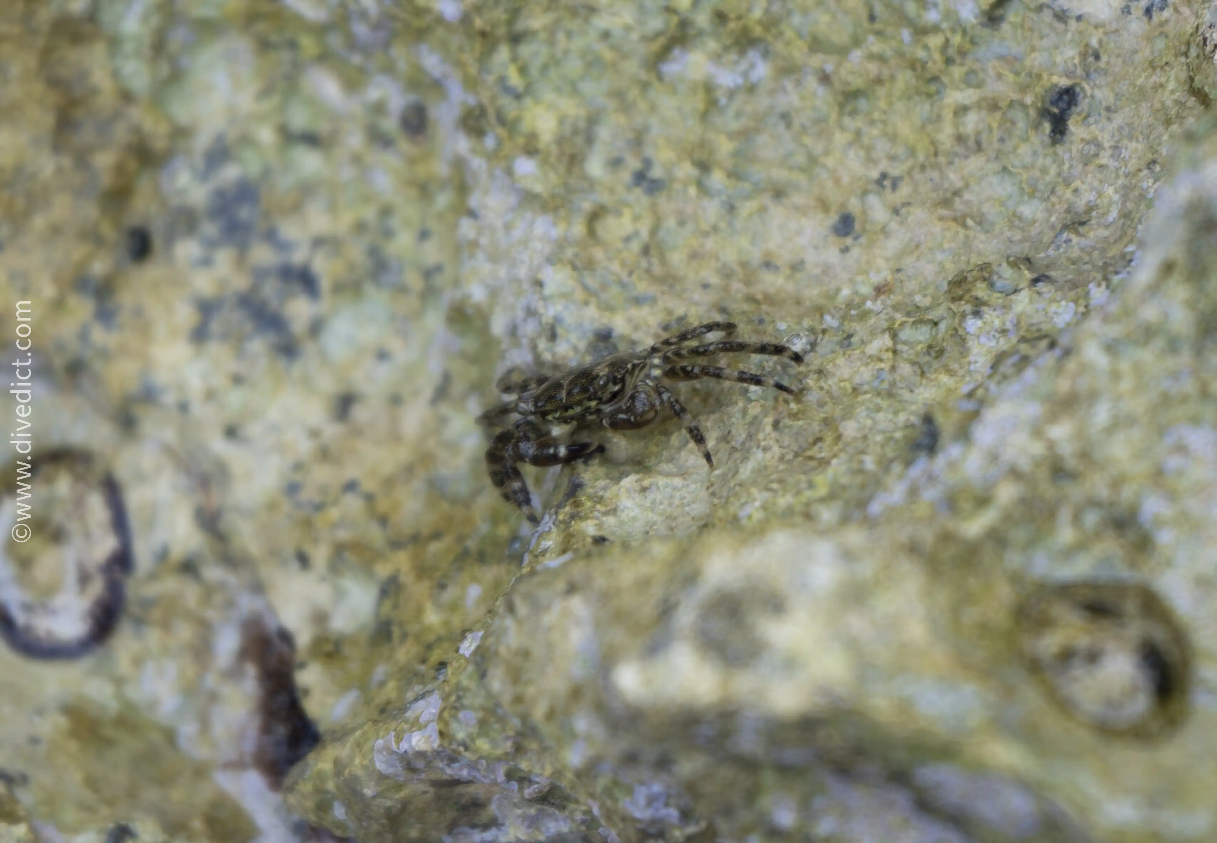 Although the marbled rock crab travels a lot out of the water (which is why it is casually called beach crab), it is still very shy.