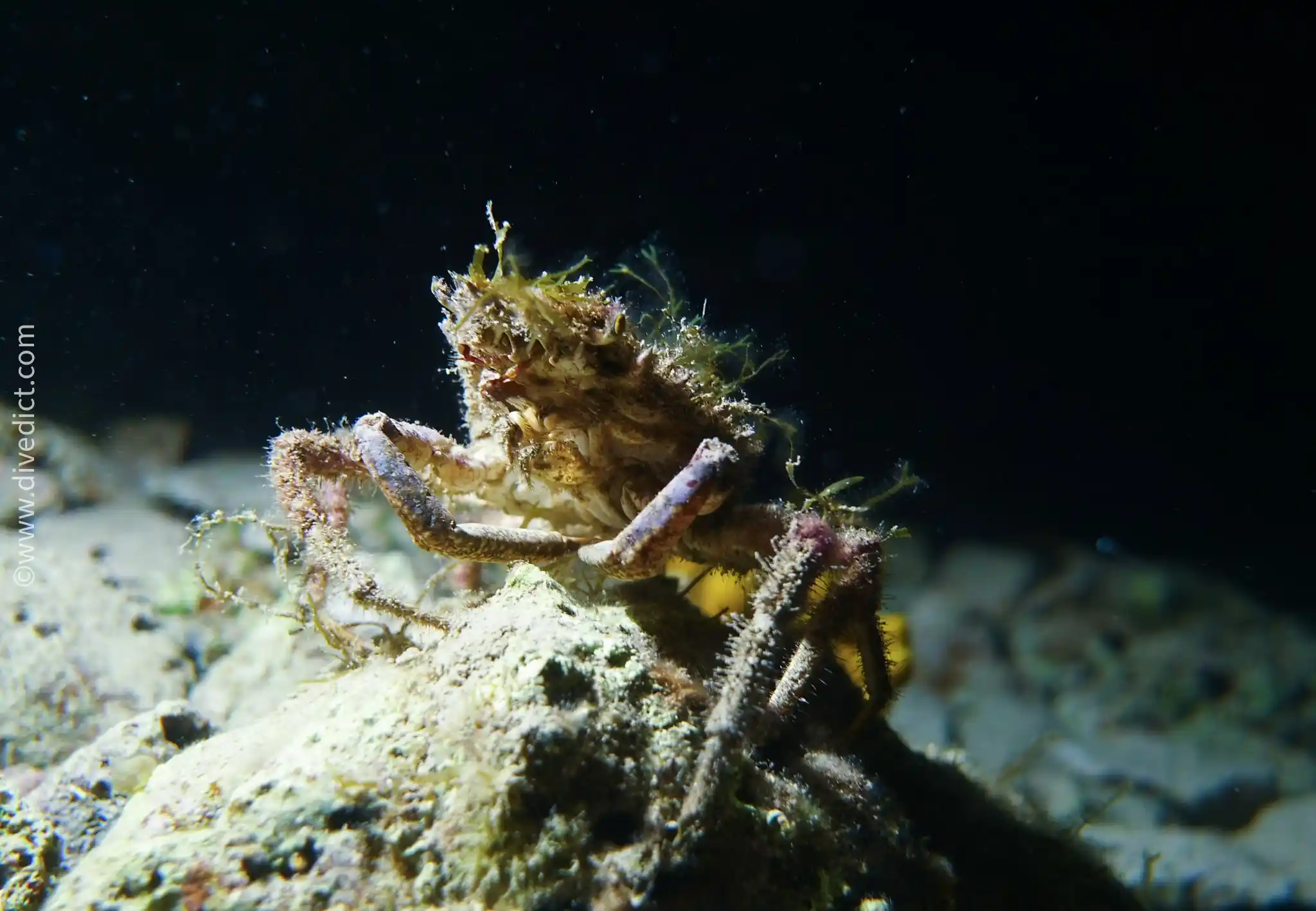 Her entire body is covered with yellow bristles, which she uses to hook all kinds of algae, sponges, sea squirts, and even rocks onto herself.