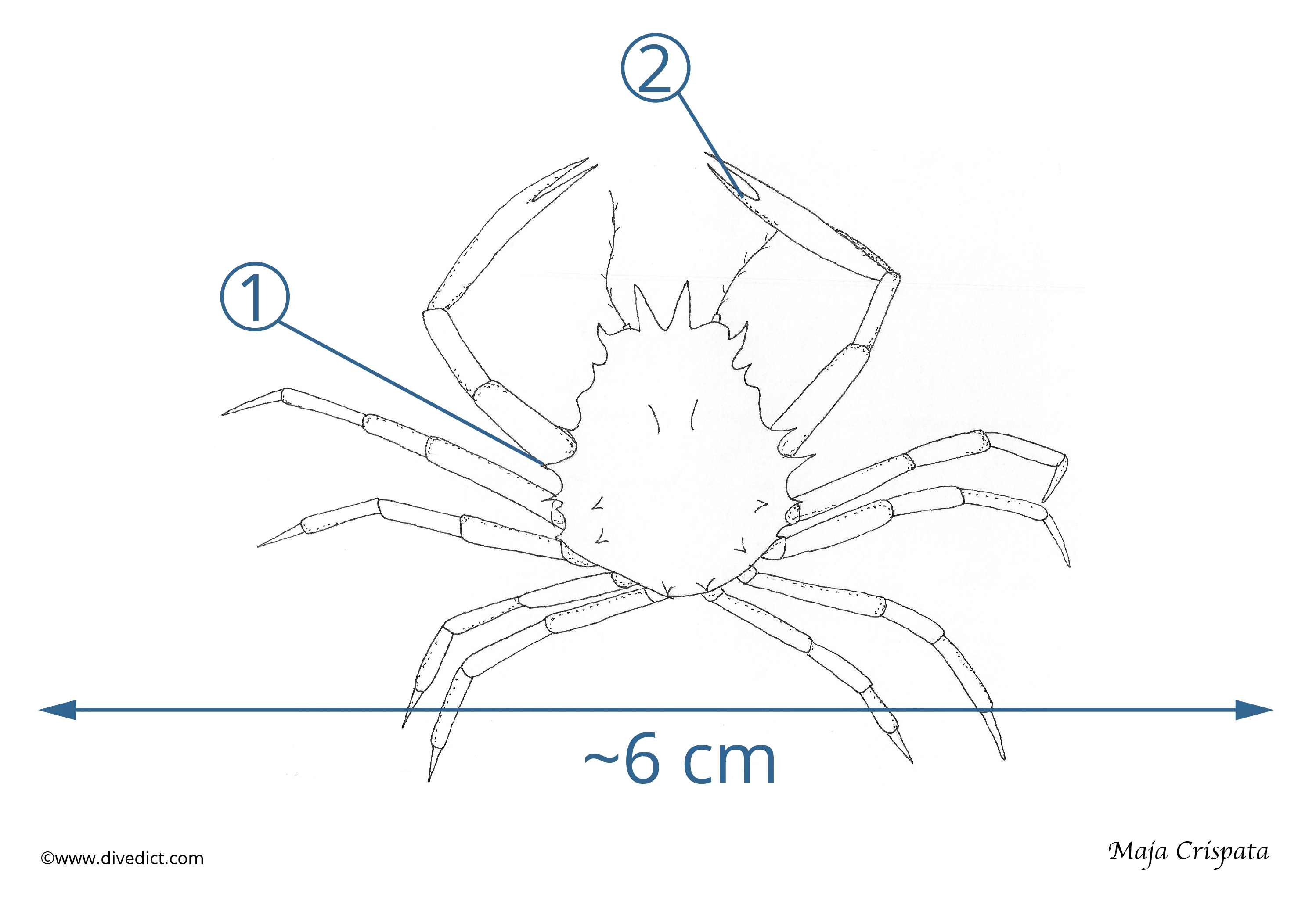 As the name suggests, spider spiders can be recognized by their long, spider-like legs. It also differs from other crabs by its rather triangular body, which is longer than wide.