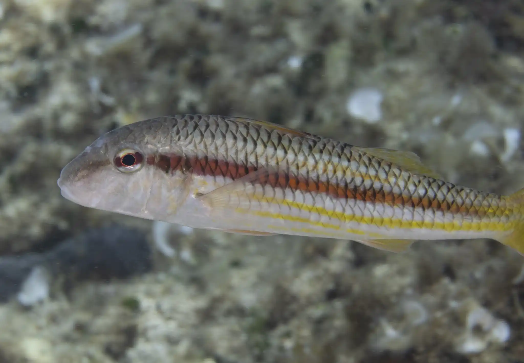 The striped mullet is oblong and relatively wide, with a straight stomach. It has a distinctive, orange-red stripe that runs from the eye to the tail fin.