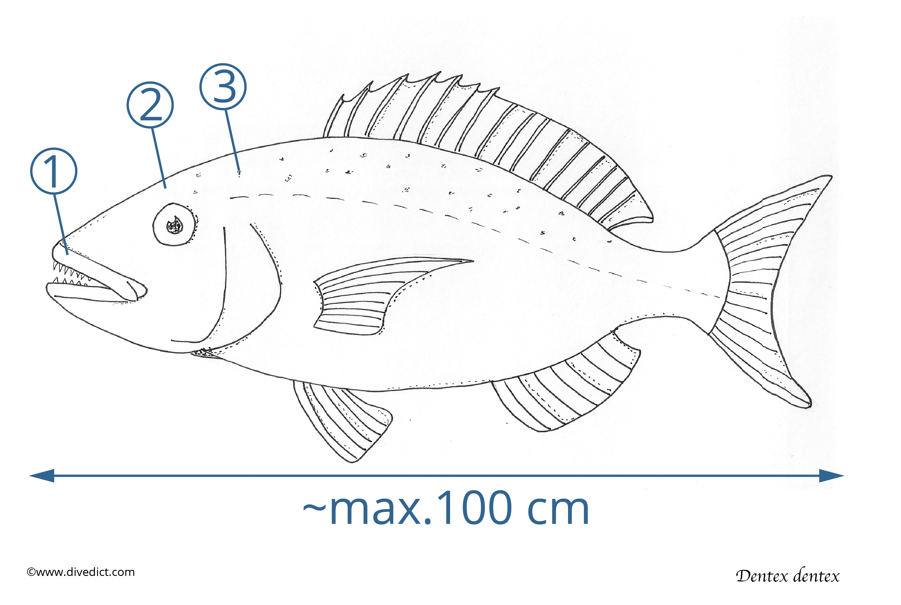 The Common dentex has a short but strong, oval body with large scales and a long bridge of the nose, which is actually the frontal bone.