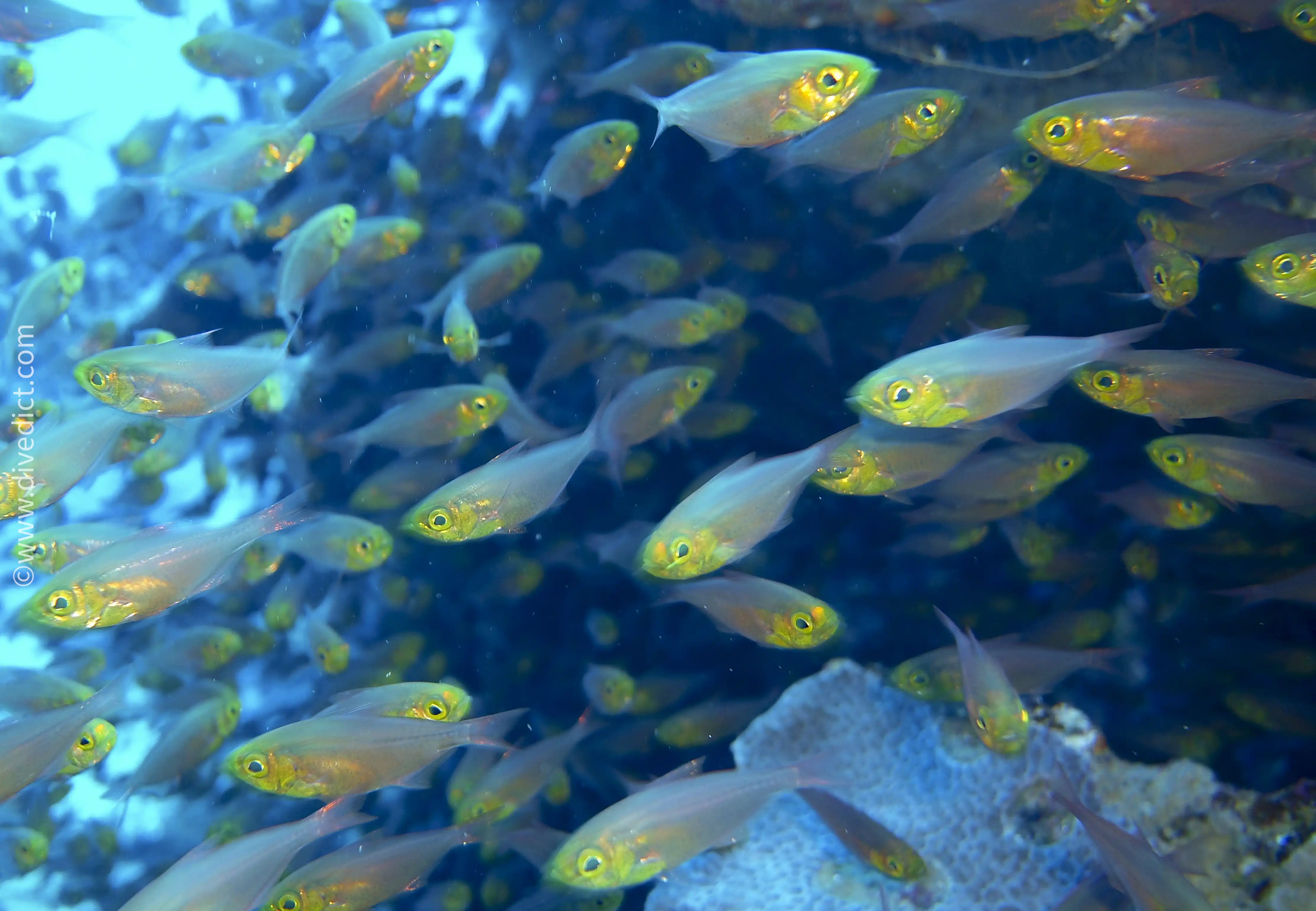 During the day, they hang out in tight, stationary schools — often tucked away under ledges, in caves, or within crevices.