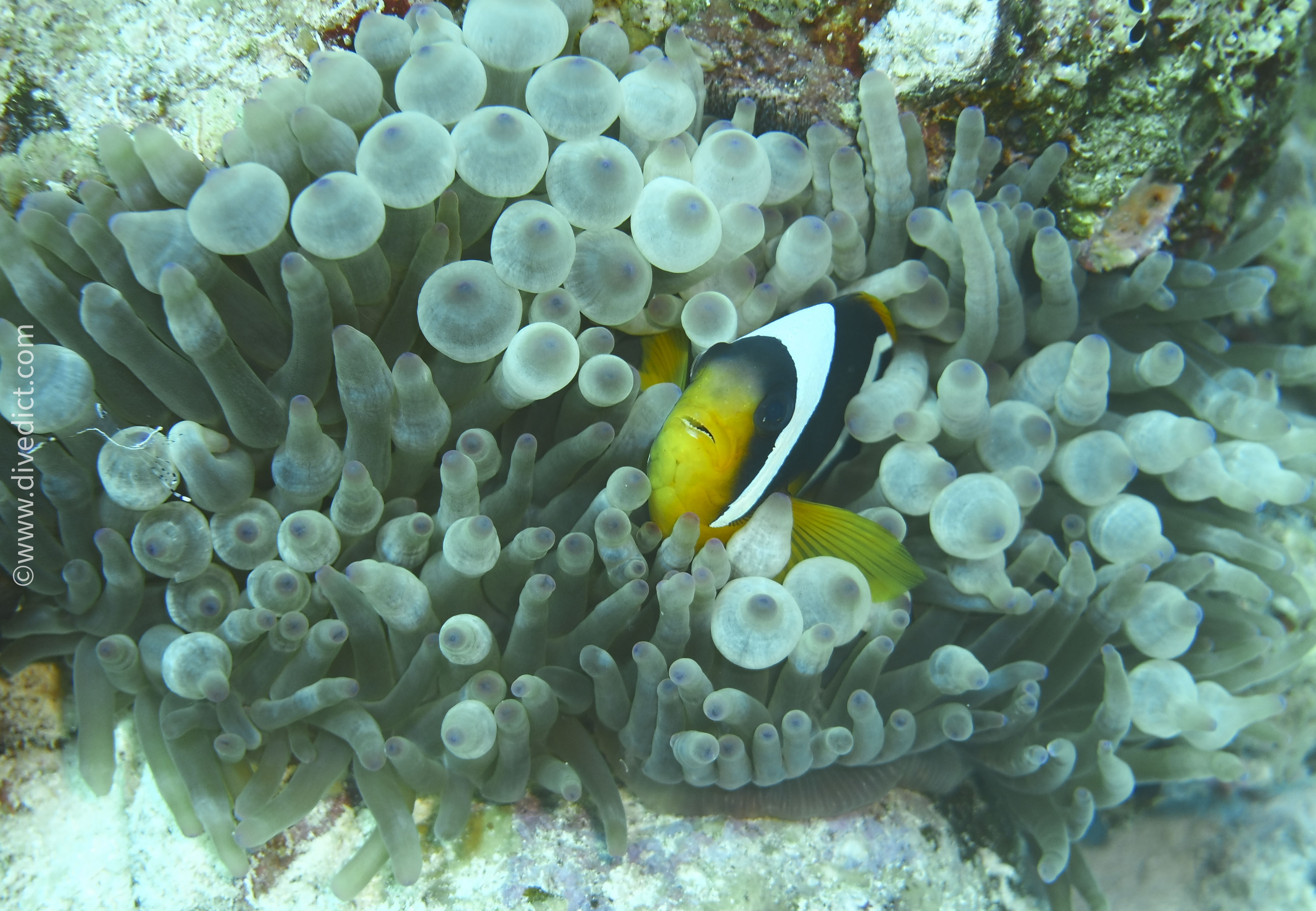 This species is known for its incredible variety of colors – individuals can be black, orange, yellow, or even white. But one feature is always the same: the distinctively forked tail fin. That’s a handy way to tell it apart from other anemonefish.