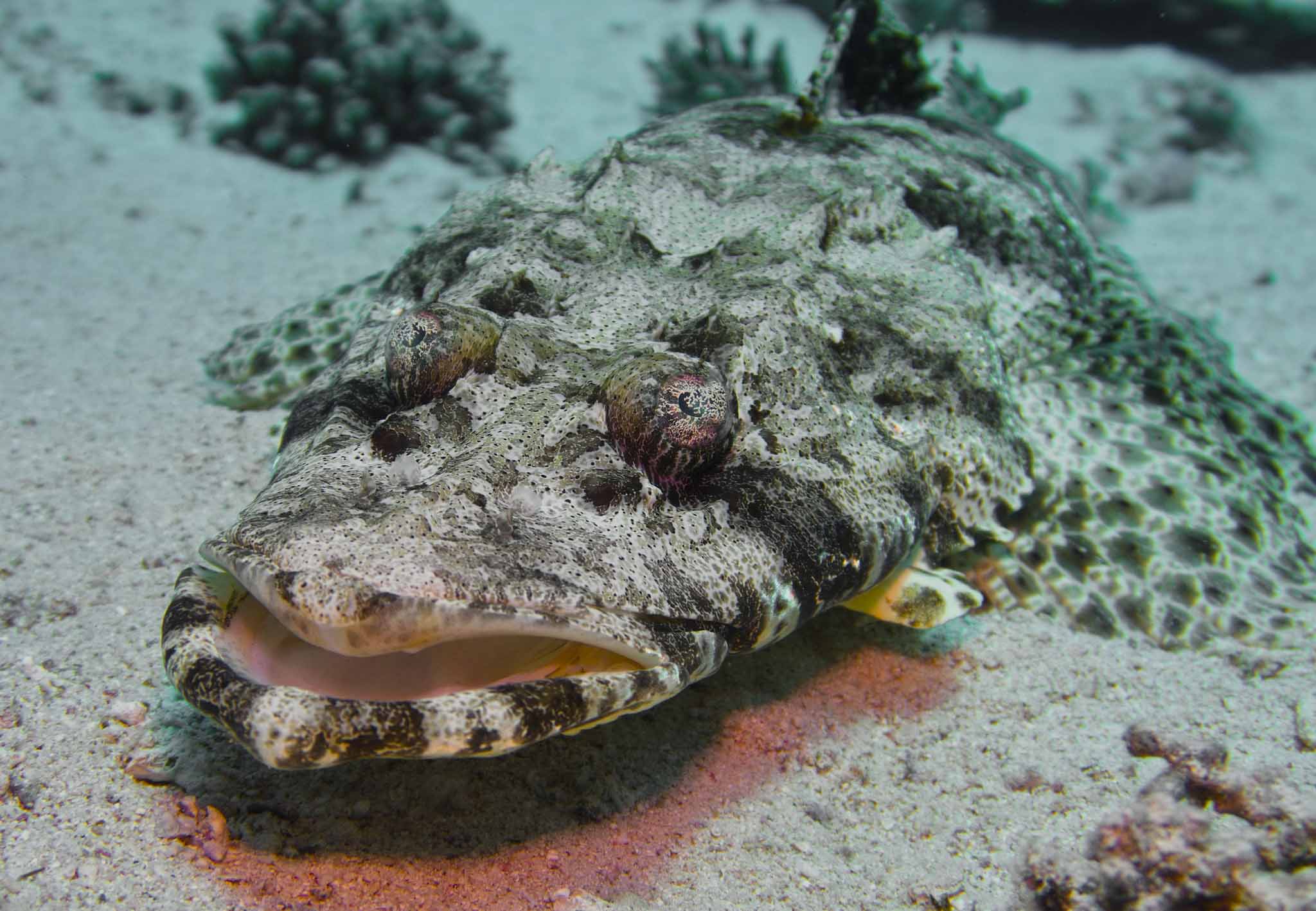 The Tentacled Flathead is also temporarily referred to as a crocodilefish due to its flattened body. Its large mouth, with the lower jaw protruding significantly, is striking. However, because of its coloration perfectly adapted to the substrate, this camouflage artist is not often seen. While it may seem threatening, it is harmless to humans.