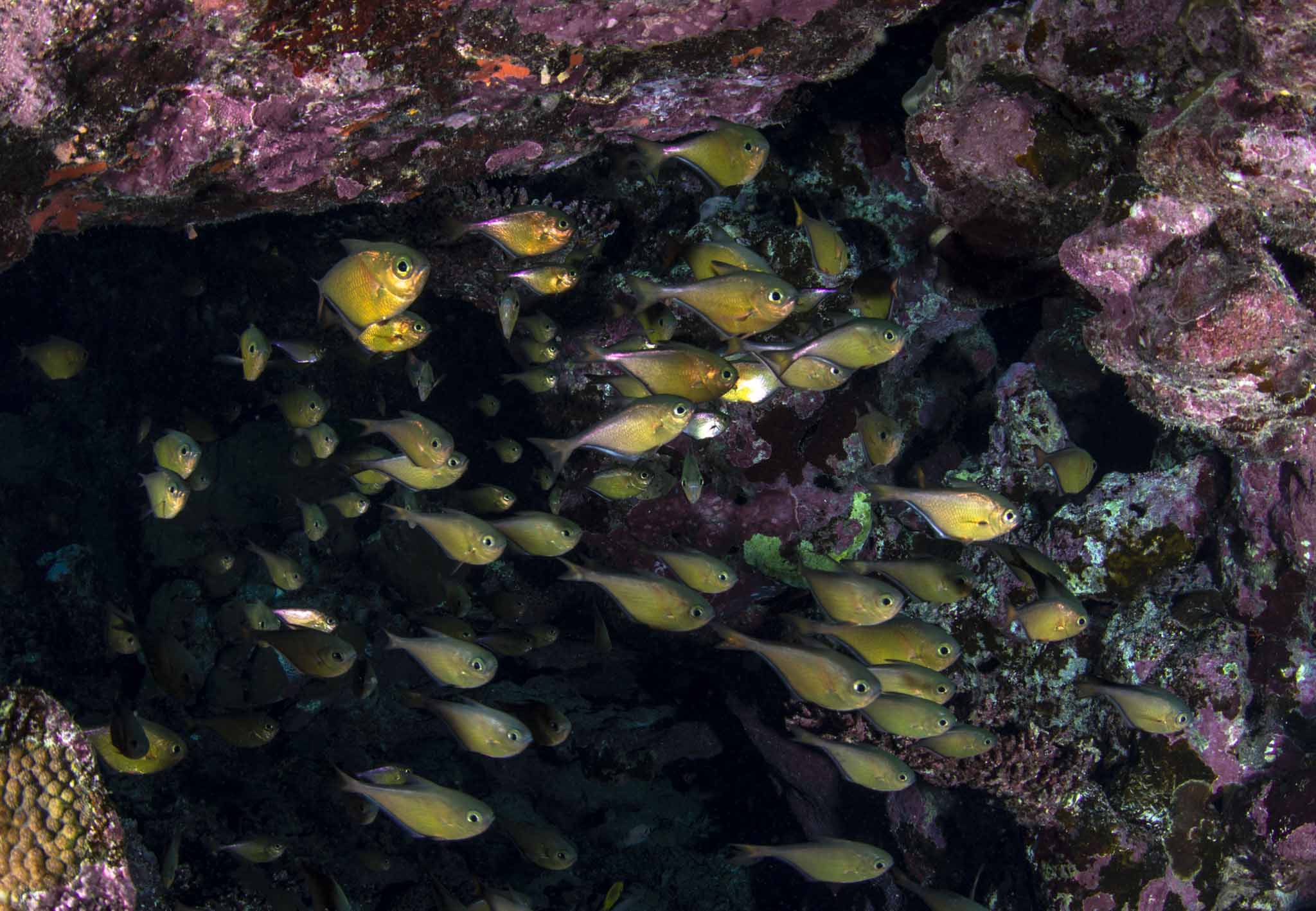 During the day, the Vanikoro Sweeper stays in groups under overhangs, caves, or wrecks to seek shelter. Pempheris swims at night in schools above the reef, sweeping through the water like with a broom, collecting plankton from the open water, thus "sweeping" up the small organisms. That's how it got its name.