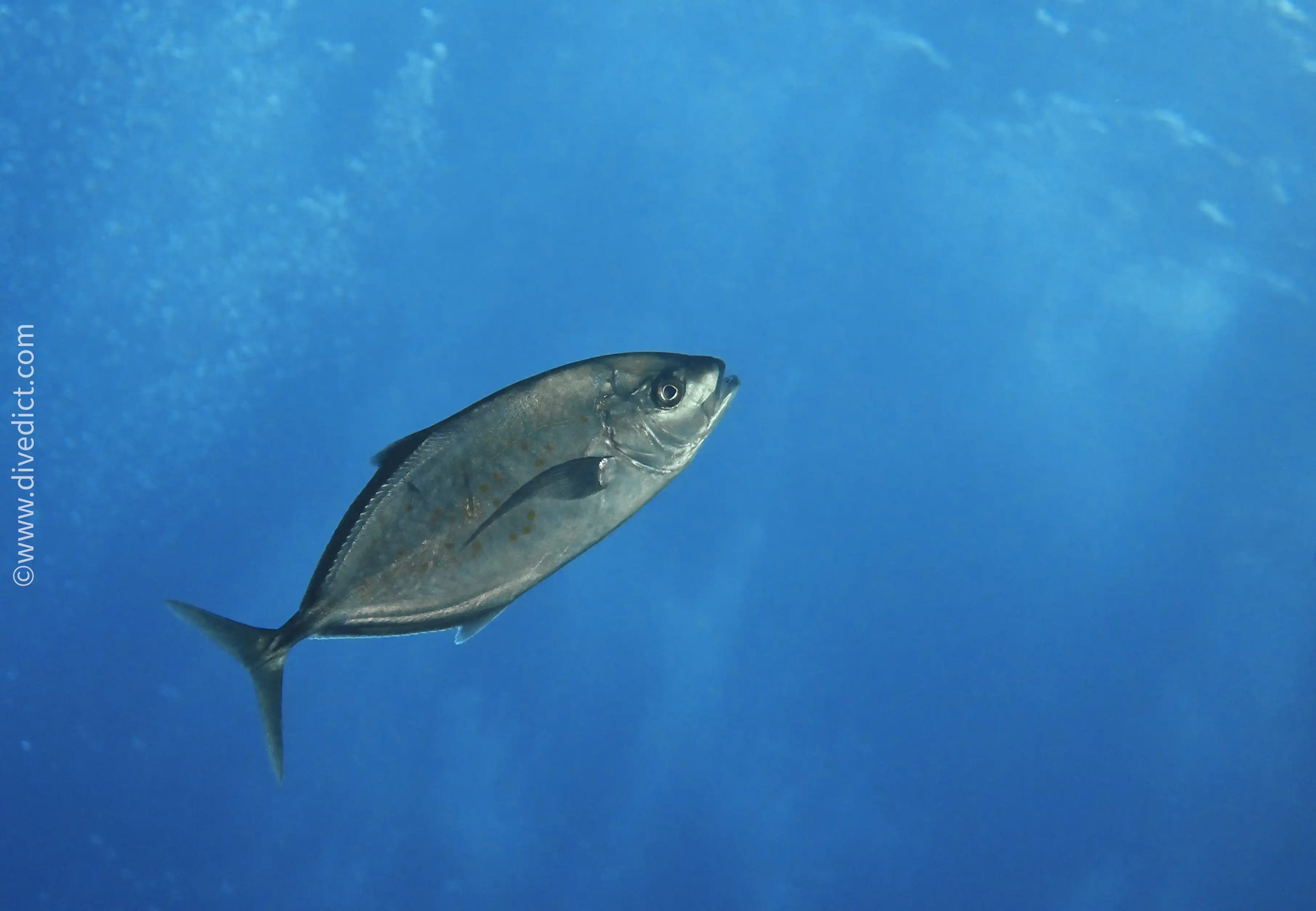 The Orangespotted Trevally feels right at home in the outer reefs of lagoons, gliding effortlessly through the waters. With its underdeveloped or completely absent swim bladder, it's constantly on the move – a true masterpiece of adaptation. Its sleek body and forked tail fin make it an expert in speed, darting between the reefs with lightning-fast precision. Whether in small groups or alone, you can often spot it elegantly tracing tight, circular paths. A fascinating detail is the keeled scales found on many of these fish, giving them a unique appearance. With its impressive speed and graceful hunting style, it’s a thrilling sight for divers.