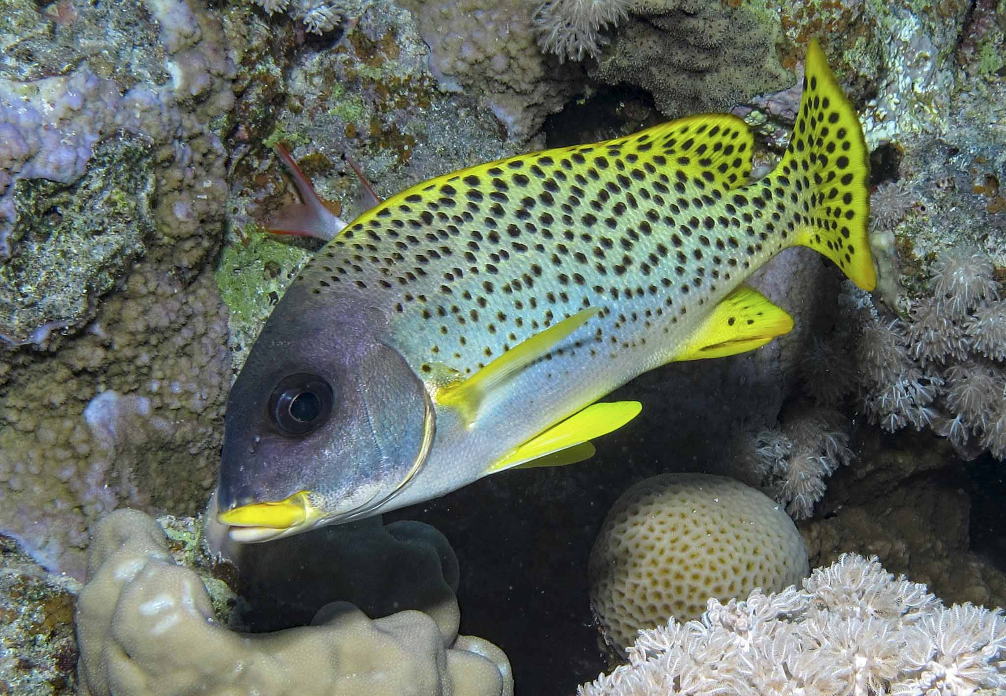The Blackspotted rubberlip belongs to the family of the so-called grunts and there's a good reason for that: It can actually produce sounds that resemble a soft grunt or creaking. These sounds are not made by vocal cords, but by the rubbing of special teeth in the back of the throat. The vibrations generated are transmitted through the skeleton to the swim bladder, which acts like a resonating body. You can sometimes even hear this while diving!