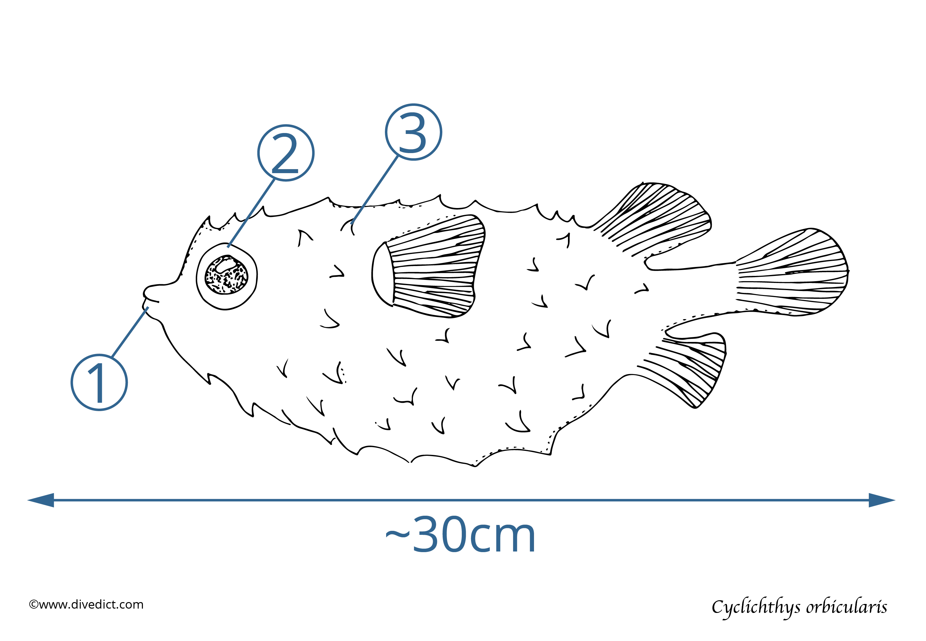 The Orbicular burrfish has a brownish to rust-brown coloration, sometimes appearing in a delicate cream shade, especially when resting on sandy bottoms. It is often covered in dark spots. Its fixed spines give it a distinctive appearance. Its most striking feature is its enormous eyes, which stand out in comparison to its body.