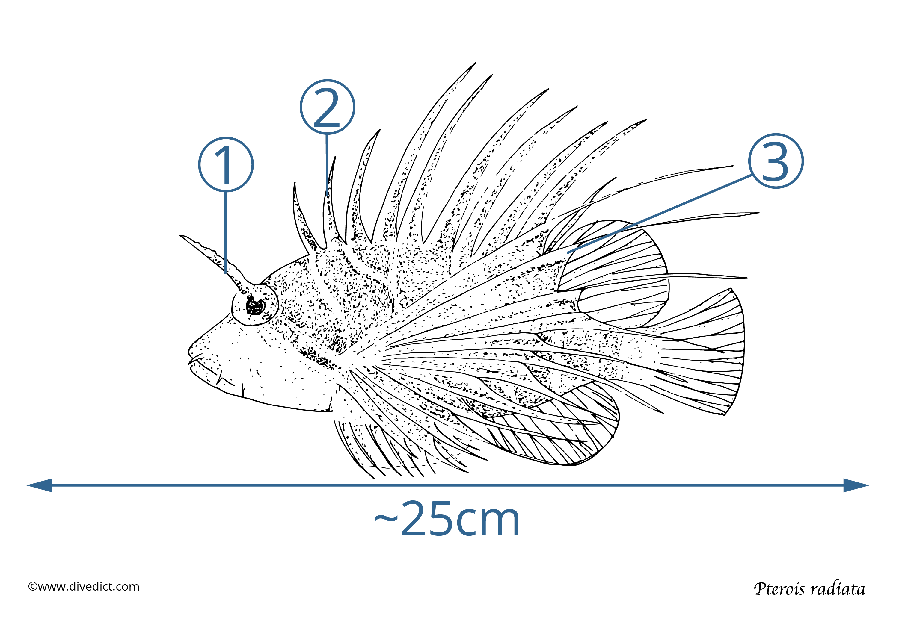 It can be recognized by the long white, free-standing pectoral fin rays and the white longitudinal stripes on the tail base.