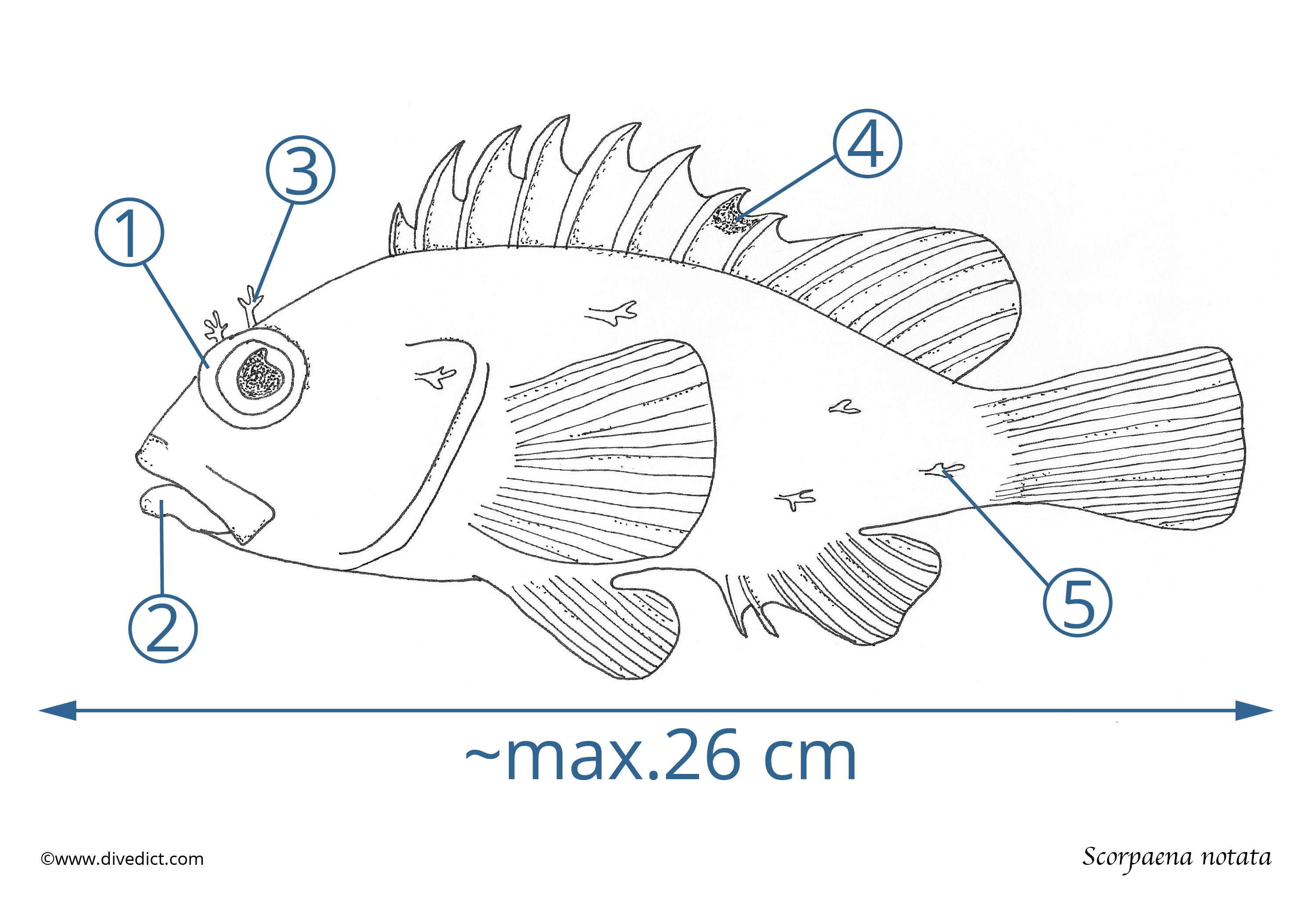 However, what distinguishes it from its relatives is the black spot on the back section of the dorsal fin and the huge eyes. Also, his eyes are crowned by small tentacles.