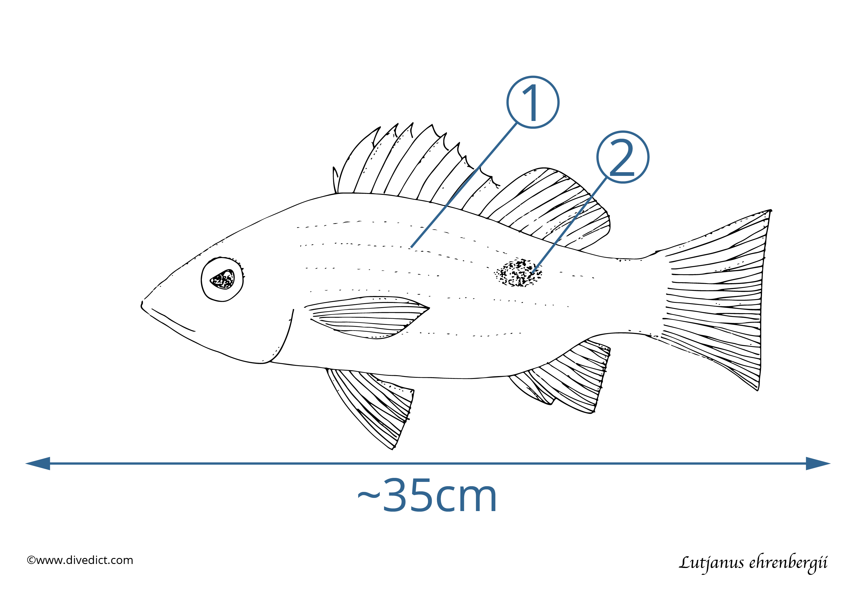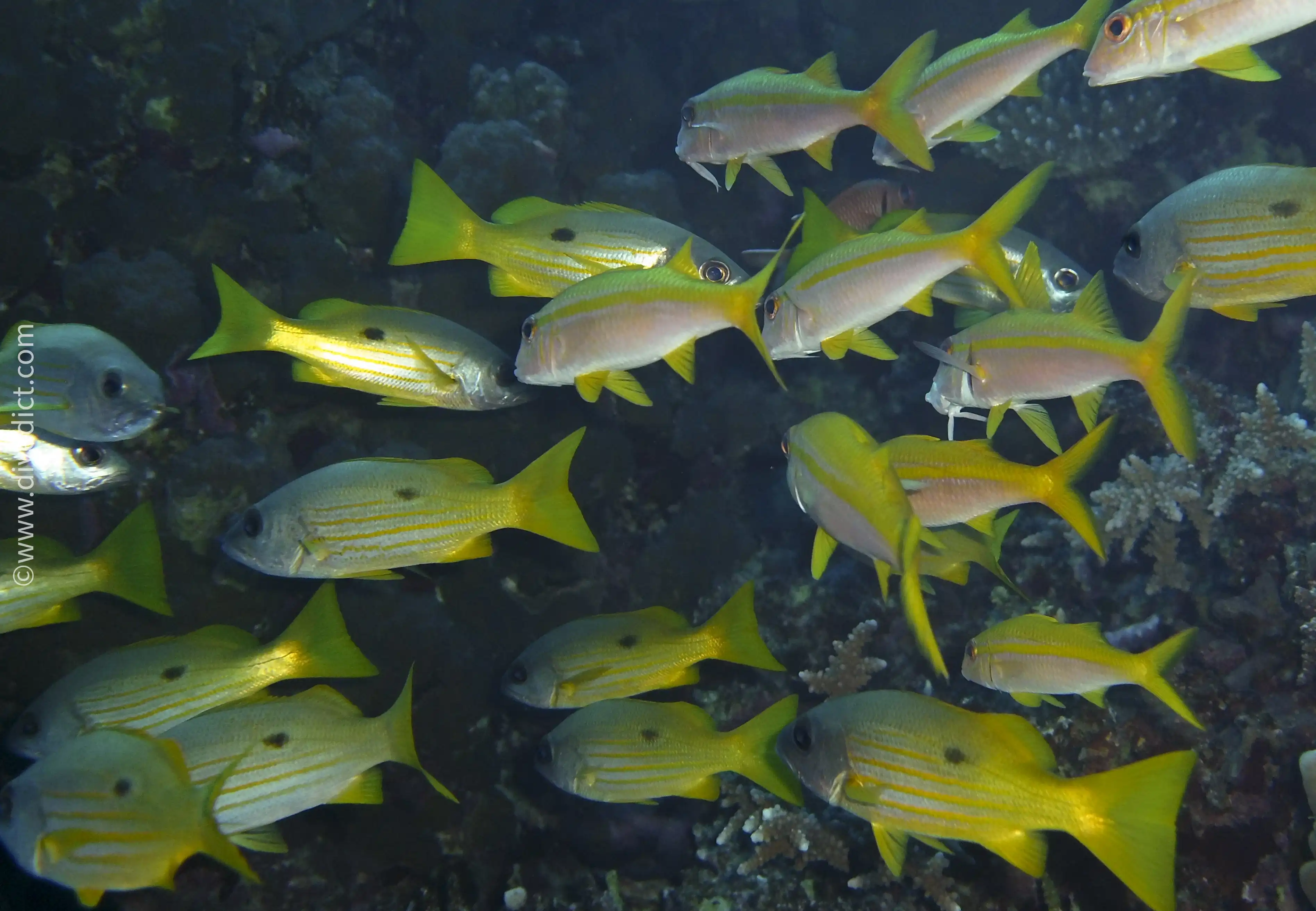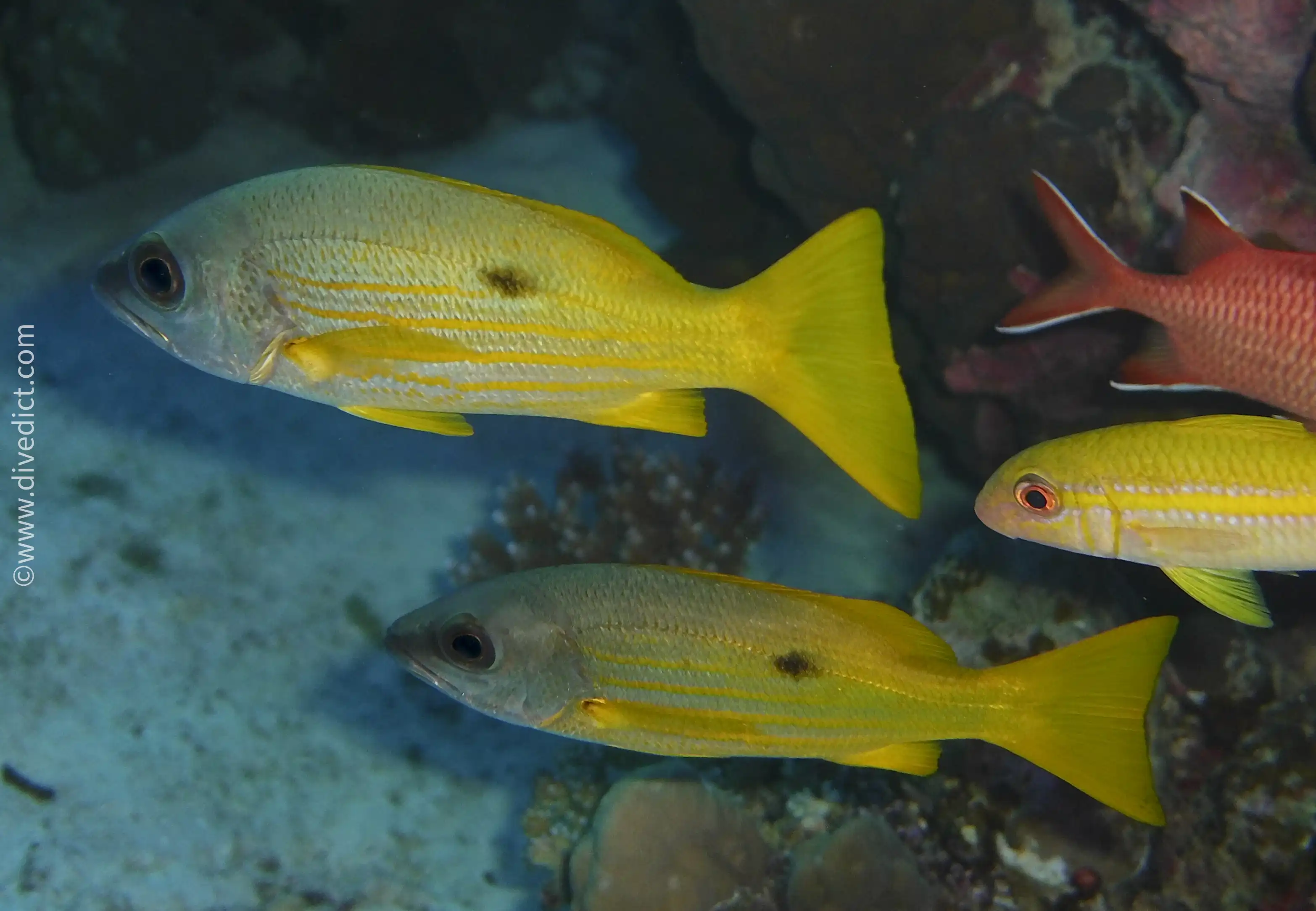 There are always exactly 5 yellow stripes across his flanks, which you can count in peace, because he is not afraid of divers at all.