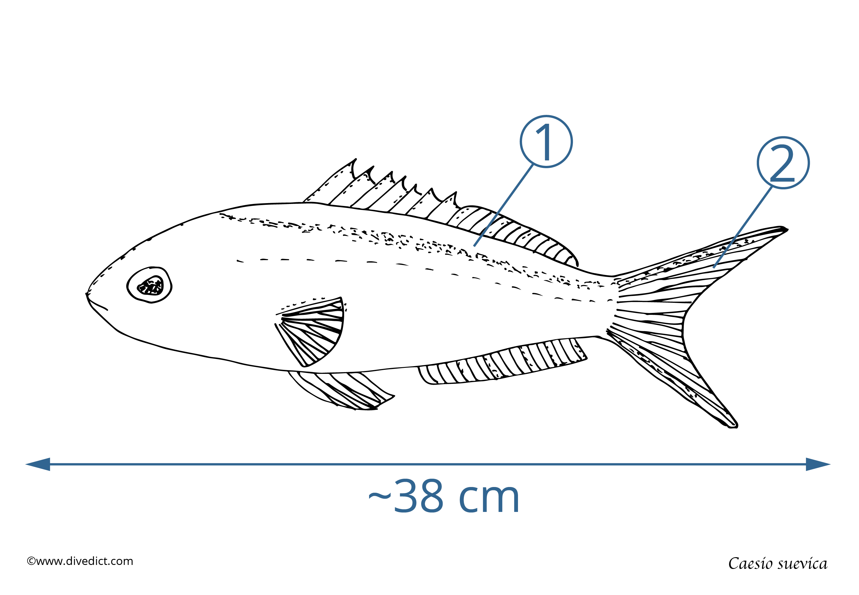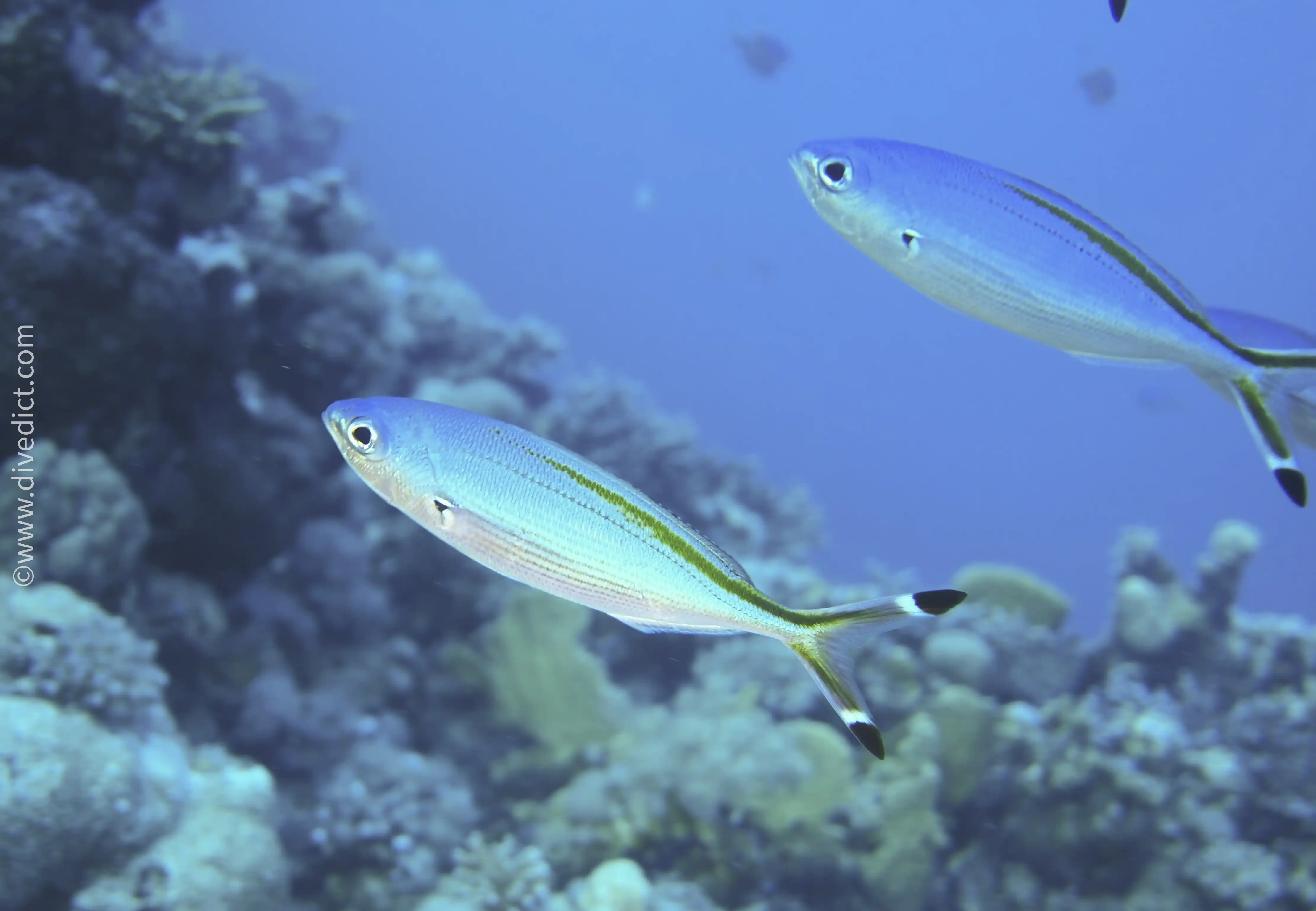 This silver arrow can be recognized by its streamlined body and its deeply forked tail fin, whose ends are spotted black and white. His mouth may be small, but he can open it wide when he wants to eat bigger bites.