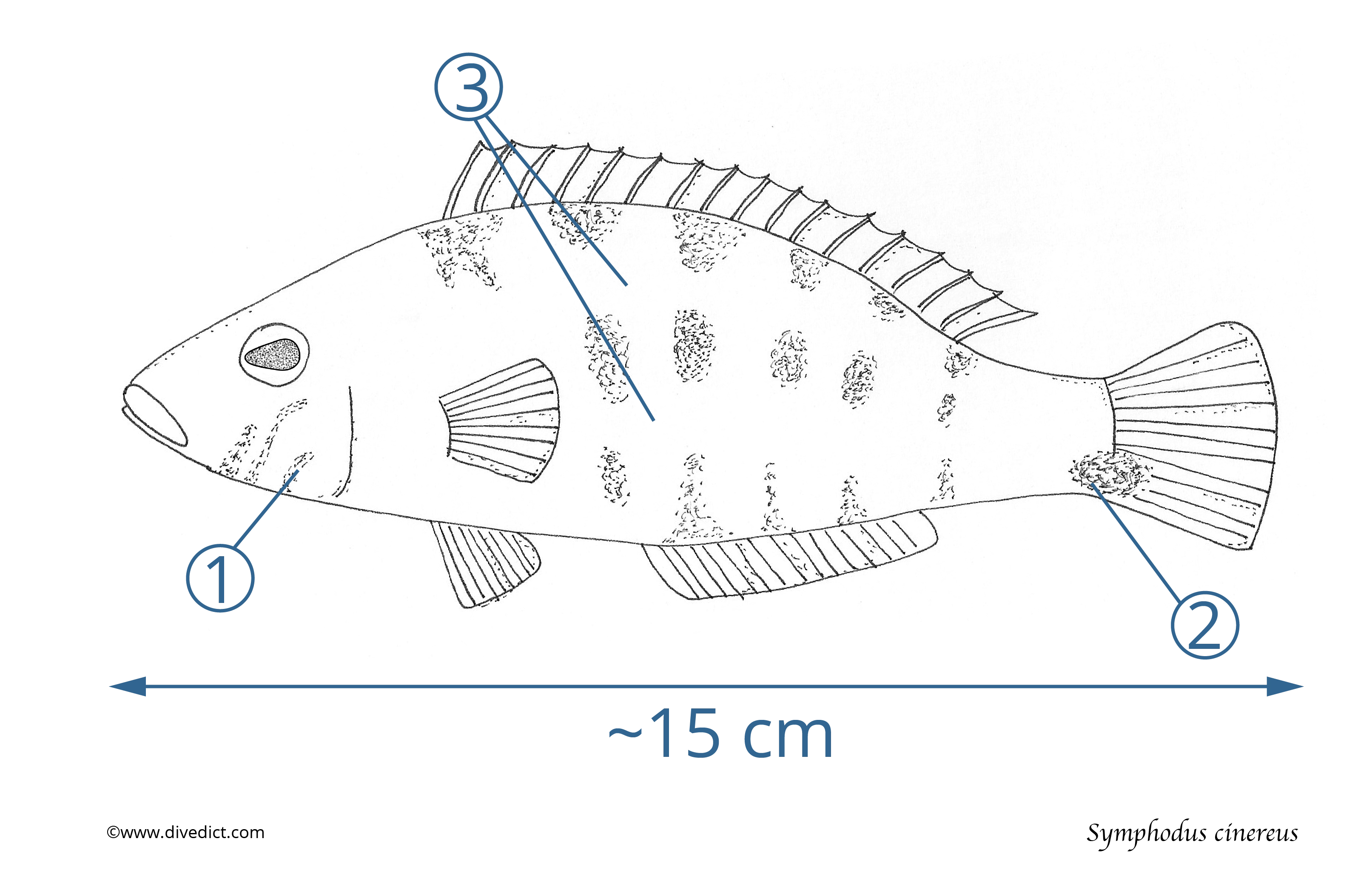 Like its conspecifics, the gray wrasse has an elongated body with a slightly raised back.