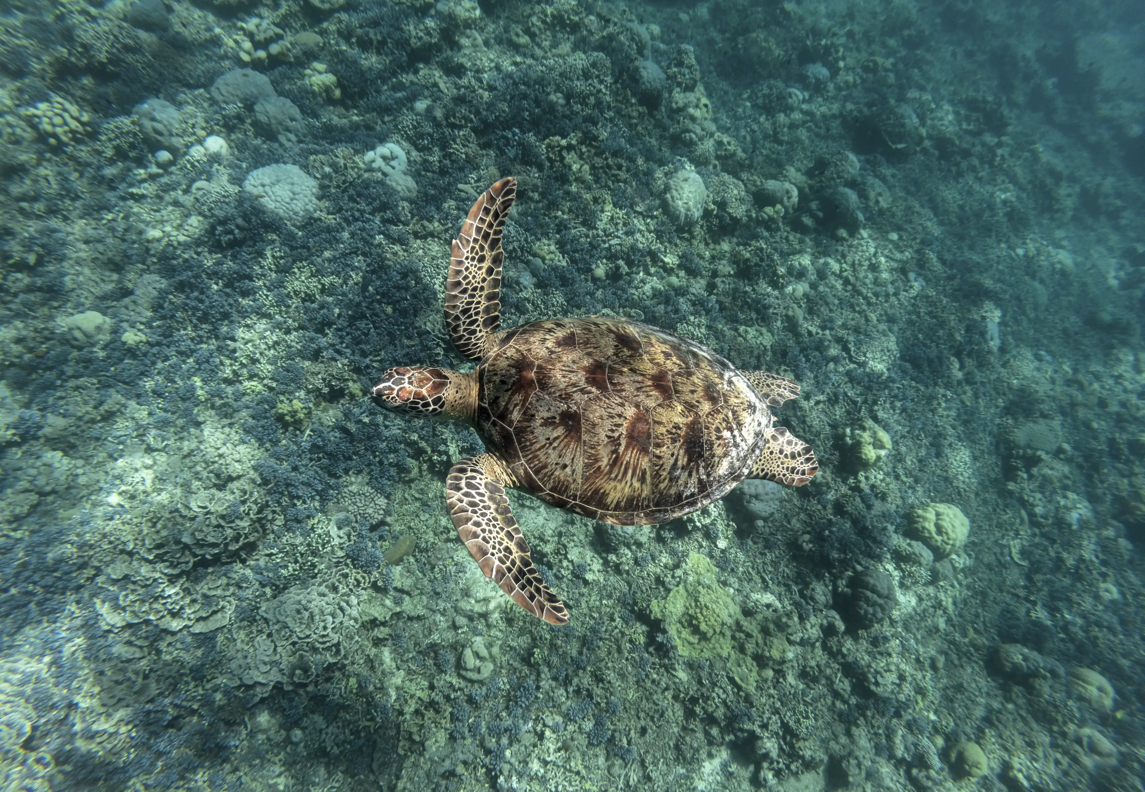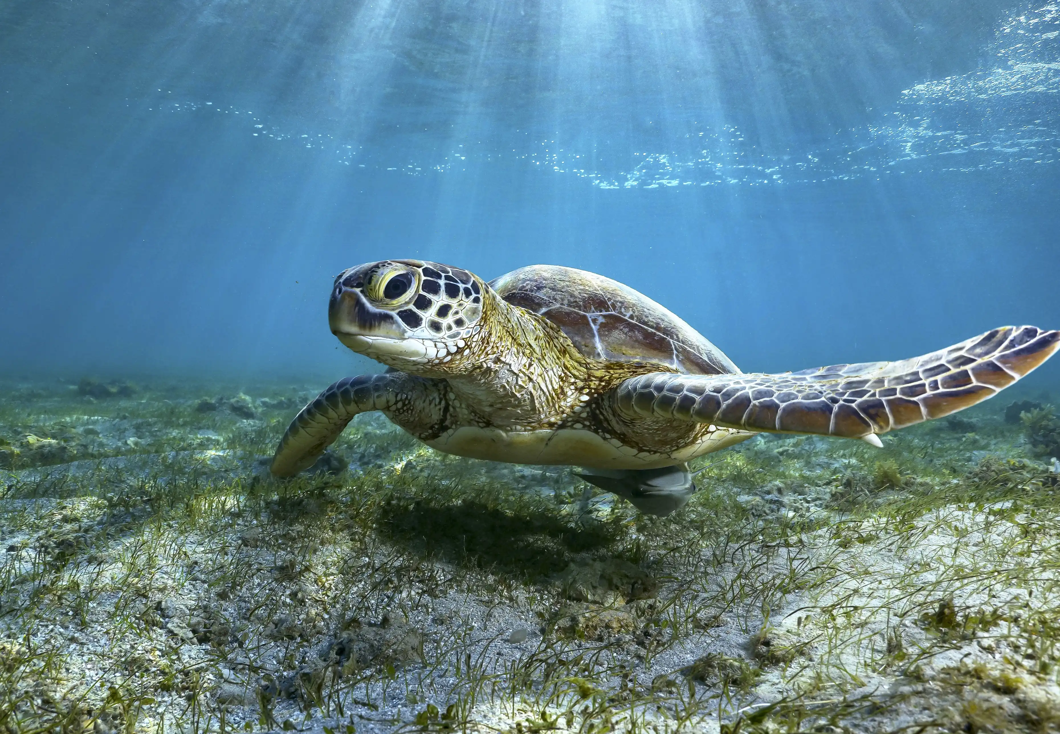 Green sea turtles are loners and spend their youth in the open sea, while the adults have fun in lush seagrass beds near the coast.