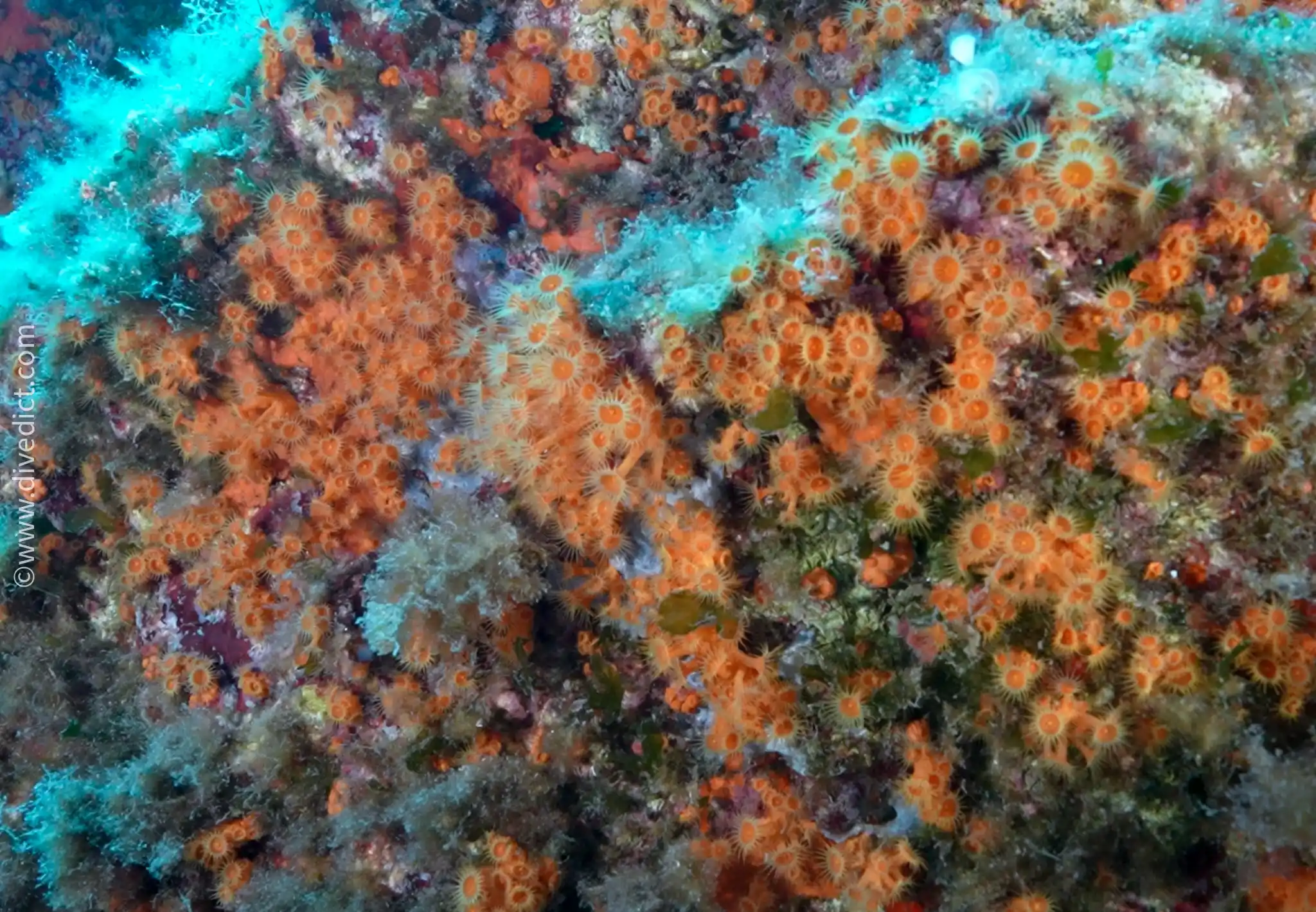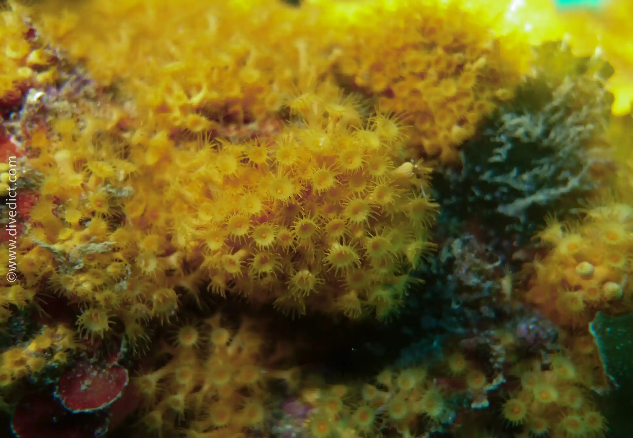 They form dense, strikingly golden yellow to orange colonies. Their pretty polyps are a maximum of 4cm long and are decorated with two circles of tentacles around the mouth opening.