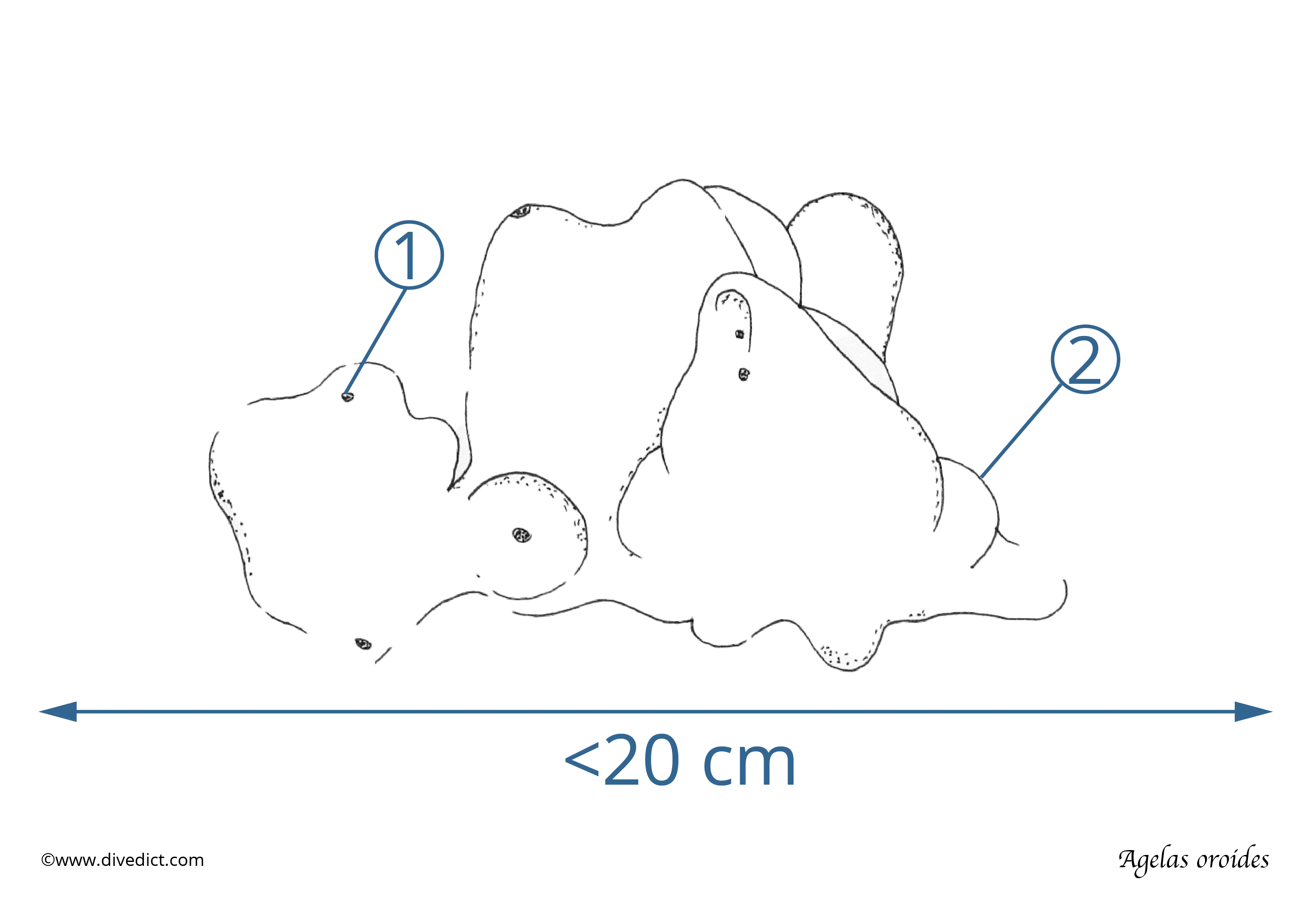 It grows up to 20cm tall, its outgrowths are short and wide with wide round osculum.